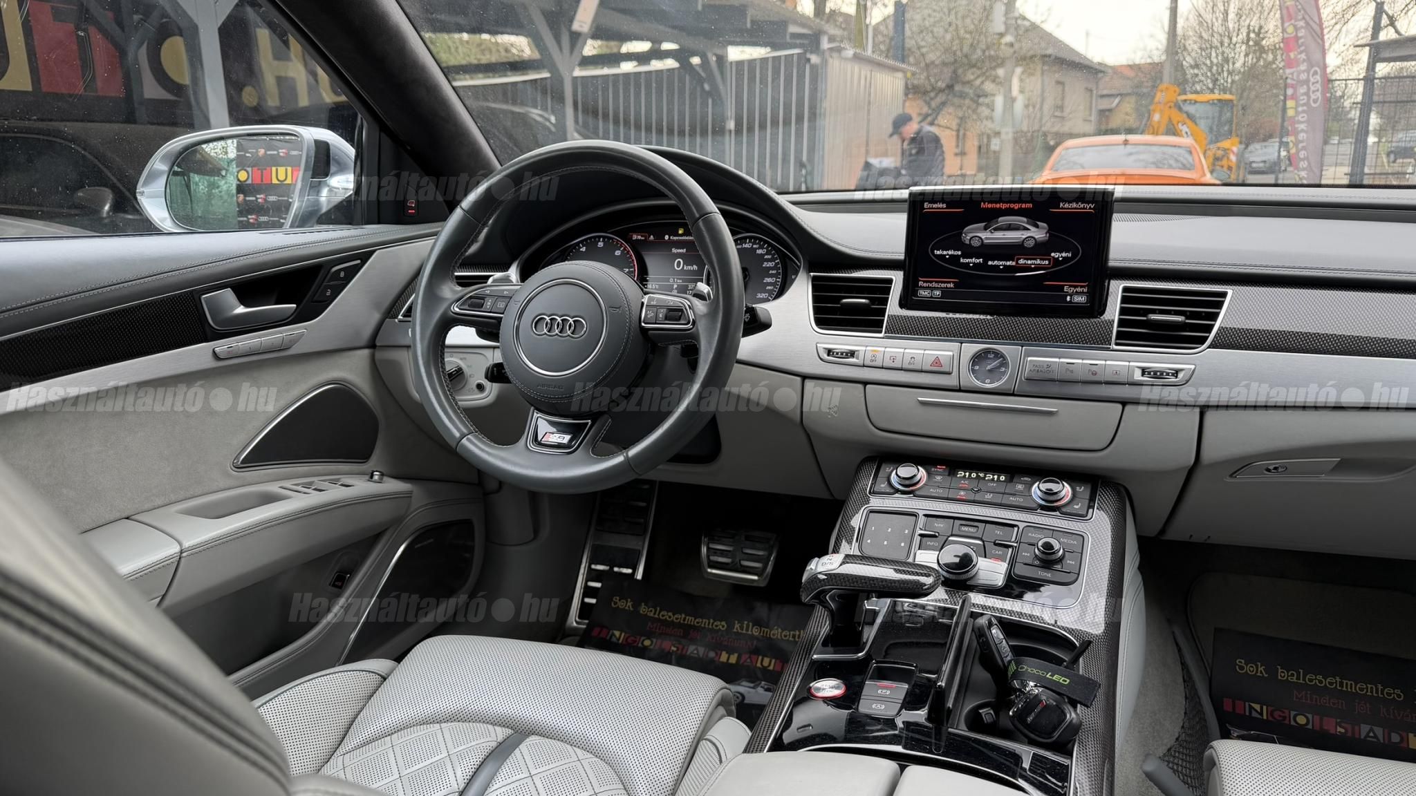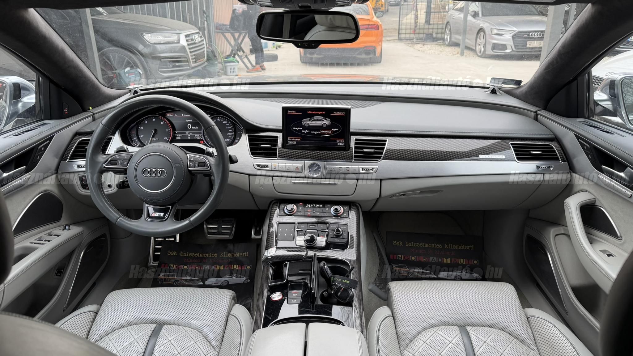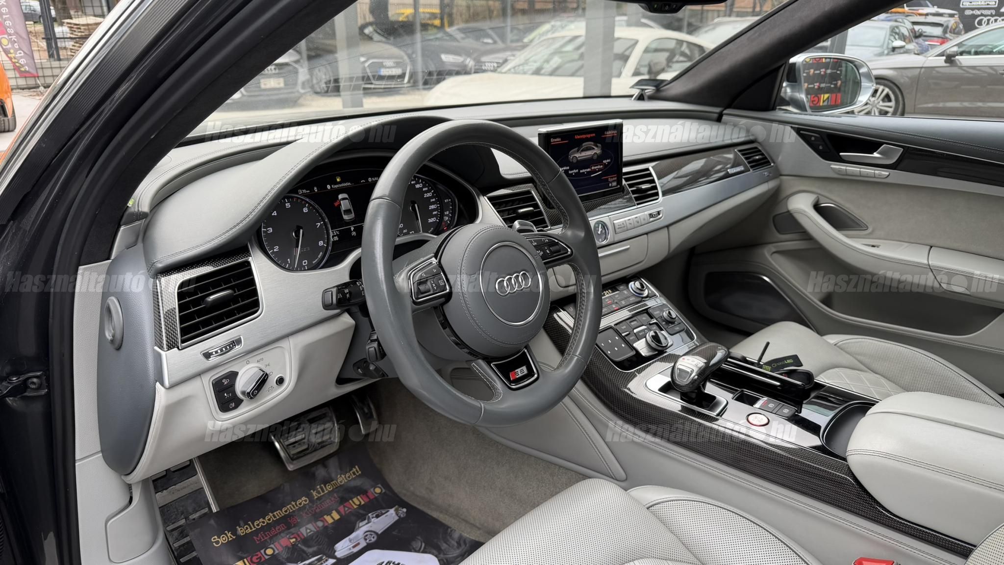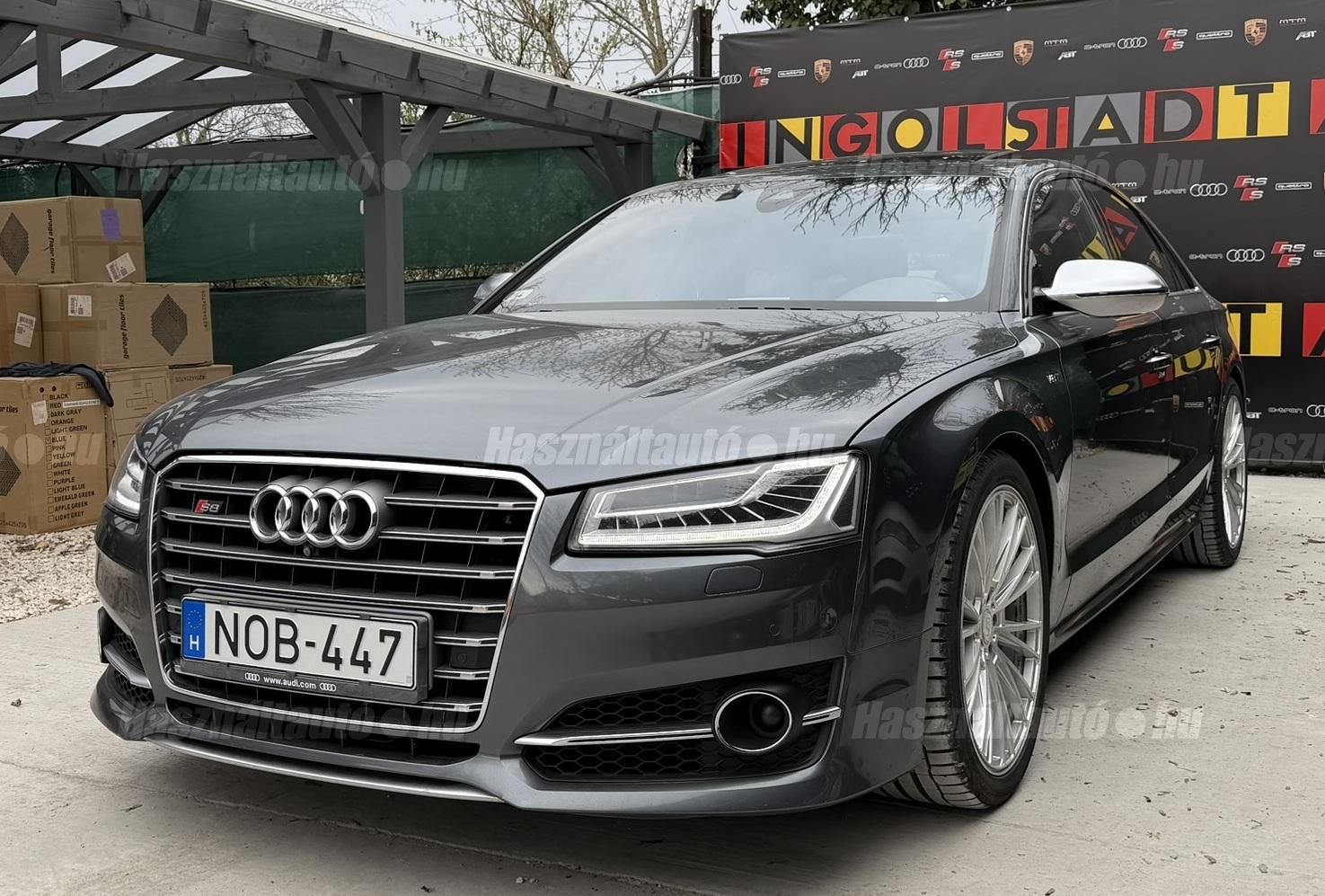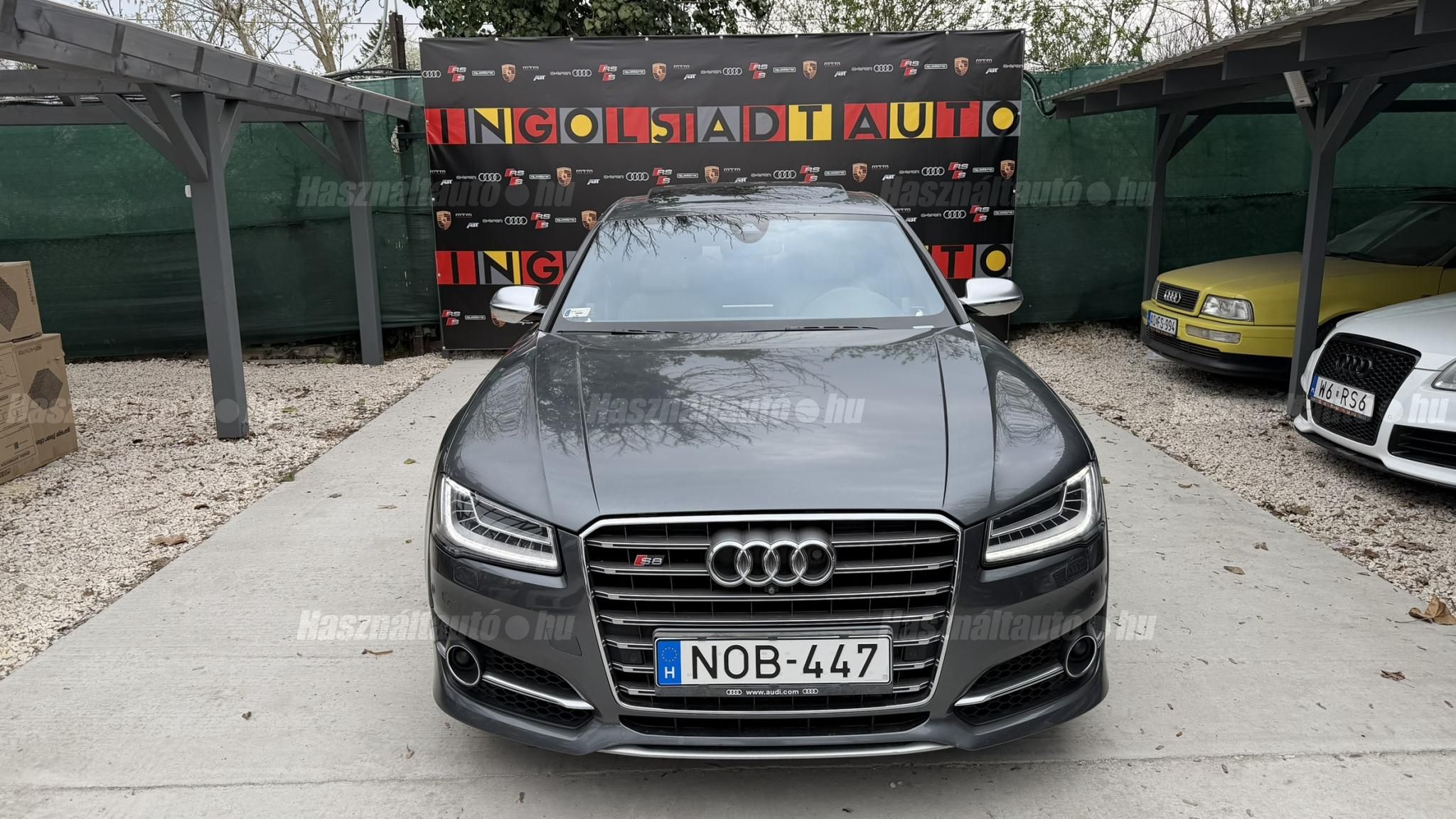 További 50 nagy felbontású kép: facebook/ingolstadtauto oldalunkon! AZ AUTÓK MEGTEKINTÉSÉHEZ MINDEN ESETBEN ELŐZETES TELEFONOS EGYEZTETÉS SZÜKSÉGES! BANKI HITELÜGYINTÉZÉSben is tudunk segíteni ez 12-84 hónapig terjedő periódusra ütemezhető. Legalább 20% önrésszel vehető fel.----------TÍPUS/ÁLLAPOT----------AZ ADOTT AUTÓRÓL:Gyönyörű Daytona Grau színű, sportos luxuslimuzin. Vezetett szervizkönyves. 2016/01-ben egy márkaszervizes visszahíváson vett részt, ahol az autót teljes körűen átvizsgálták. A turbók és a vezérlés is rendben vannak.Teljesen törésmentes, a fényezése szép, mindenhol egységes.A típusból kétféle változat készült: egy 520 lóerős alapverzió, illetve egy 605 lóerős Plus kivitel. Jelentős műszaki különbség nincs közöttük, a turbók, a motor és a váltó is azonos. Mindkét verzió egy STAGE 1 programmal kb. 680 lóerő / 900 Nm teljesítményre módosítható. Ez az S8 is ilyen STAGE 1 programmal kerül átadásra.A beltér megkímélt állapotú, nincsenek benne megmagyarázhatatlan, barbár sérülések. A szellőztethető, fűthető és masszázsfunkciós komfortülések az Audi egyik legkényelmesebb ülései közé tartoznak. Minden irányban elektromosan állíthatók (deréktámasz, oldaltartás, vállrész), így maximális kényelmet biztosítanak.A beltérben többféle anyag és szín találkozik, mégis tökéletes harmóniát alkotnak. Az autót Carbon csomaggal rendelték, így a luxus megjelenés mellett a sportosság is hangsúlyos.Nagyon sok extra található benne, ezeket a videóban részletesen bemutatjuk.Szerkezetileg és motorikusan hibátlan, minden extra tökéletesen működik.A 21 colos, préseléssel kovácsolt Axe felnik jó állapotúak, minimális sérülések láthatók rajtuk. Jelenleg jó állapotú Hankook nyári gumikkal szerelt.A kerámia fékrendszer állapota jó, a fékbetétek még nincsenek kopásjelzőn.Minden tartozék rendelkezésre áll: összes gyári dokumentáció, vezetett szervizkönyv, valamint 2 db eredeti kulcs.A TÍPUSRÓL: Larry, mondd el Vincentnek, mire van szükséged! Valami nagyon gyors kell. Egy Audi S8-as. Olyan, ami odalép… ha kell./Ronin/Az Audi S8 ikonikus modell lett nemcsak gyors, hanem harcra kész is volt, és a filmjelenet sokunkban maradandó élményt hagyott.Az Audi legnagyobb luxuslimuzinja, amelyben tökéletesen ötvöződik a sportosság, a kényelem és a luxus. Nemrég mentem vele egy kört pályán állapotfelmérés keretében, és még mindig megvan a respektje az utakon megjelenése mai szemmel is tiszteletet parancsoló.Ez az Audi S8 D4 facelift egy 4.0 literes, V8 biturbó motorral szerelt csúcsmodell, amely ebben a kivitelben 520 lóerőt és 650 Nm nyomatékot kínál.A motorhoz az Audi egyik legmegbízhatóbb, 8 fokozatú tiptronic automata váltója, valamint az állandó quattro összkerékhajtás társul, amely kiemelkedő stabilitást és tapadást biztosít.A V8-as motor karaktere lineáris és rendkívül kifinomult: alacsony fordulaton nyomatékos, magasabb tartományban pedig sportosan húz, mindezt szinte késlekedés nélkül. A turbók a hengersorok között helyezkednek el (hot V kialakítás), ami gyorsabb reakciót és hatékonyabb működést eredményez.A konstrukció különlegessége, hogy a nagy teljesítmény ellenére a hengerlekapcsolásos rendszernek (COD) köszönhetően képes gazdaságosabban is üzemelni.Gyári fogyasztási adatok:Városi fogyasztás: 13.6l/100kmOrszágúti fogyasztás: 7.3l/100kmVegyes fogyasztás: 9.6l/100km----------EXTRÁK----------4x ülésfűtésKormányfűtésVezetéstámogató rendszer: Sávváltó és sávtartó asszisztens (Side Assist és aktív sávtartó asszisztens) beleértve a z első és hátsó érzékelőketKipörgésgátló rendszer (ASR)Hátsó ablakok sötétítettek, beleértve a dupla üvegezéstMMI Touch (Érintőképernyő)Audi zenei interfaceMultimédia interfész MMIUniverzális Bluetooth csatlakozóAdaptív féklámpaAktív zajszűrés (ANC)Ambient világításRádió kiegészítő: Audi zenei interfészAutomatikus légkeringés-szabályozásKülső és belső világítási csomagKülső világítási csomagAszférikus külső tükör, balKülső aszferikus tükör, jobbLED irányjelzők az oldaltükrökben integrálvaFékrendszer visszanyerési rendszerrelLopásvédelem a kerekekhez (kerékzárak)Ajtó küszöbvédők monogrammalHátsó üléssor elrendezése Csomagtér csomagAutomata sebességváltó - Tiptronic (8 sebességes)Hátsó pohártartóPohártartó a középső konzolbanBelső felszerelés szénszálas befejező betétekkelBelső felszerelés: Betétek alsó befejezéssel Csiszolt alumíniumBelső kialakítás: kibővített alumínium hatásBelső visszapillantó tükör automatikus vakításgátló rendszerrelKarosszéria: 4 ajtóElülső Comfort sportülés csomagTeljes bőr csomagAlcantara csomagElektromosan állítható szervó (kormánykerék)Megvilágított sminktükörElektromechanikus kézifékPótkerék mint vészkerekKörnyezetvédelmi rendszer Euro 6 szabványBőr sebességváltókarAutomatikus ajtózárÜléshűtés és masszázsfunkció elölÜléshuzat / kárpitozás: Alcantara / Valcona bőrSpeciális festés Daytona GrauHangrendszer Bang&OlufsenElektromos napellenző redőny a hátsó ablakonNapellenző redőny a hátsó ablakon és a hátsó oldalsó ablakon elektromosan.Gumikontroll mutatóÉjjellátó360-as kameraAudi Matrix LED fényszórókVezetéstámogató rendszer: Sebességkorlát jelzőLED hátsó lámpákFékasszisztensElülső középső kartámasz Kényelmi felszerelésAutomatikus csomagtérajtó nyitásCsomagtér-ajtó zárássegítőFény- és esőérzékelőSport kipufogó rendszerElektromosan állítható, fűthető és behajtható külső tükrök automatikus sötétítéssel és járdafunkcióvalKülső tükör automata járdaparkolással, jobbElektromosan állítható külső tükrök, memór