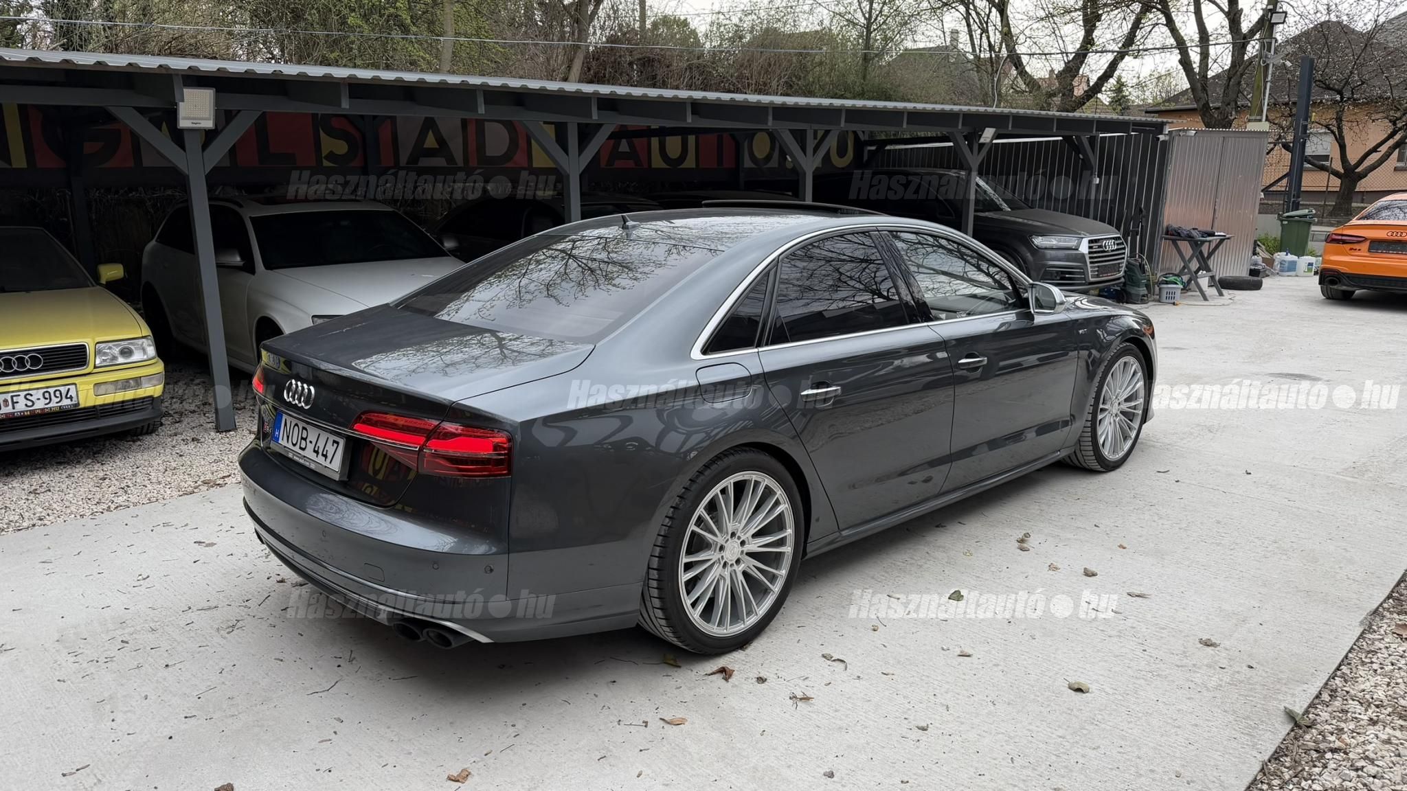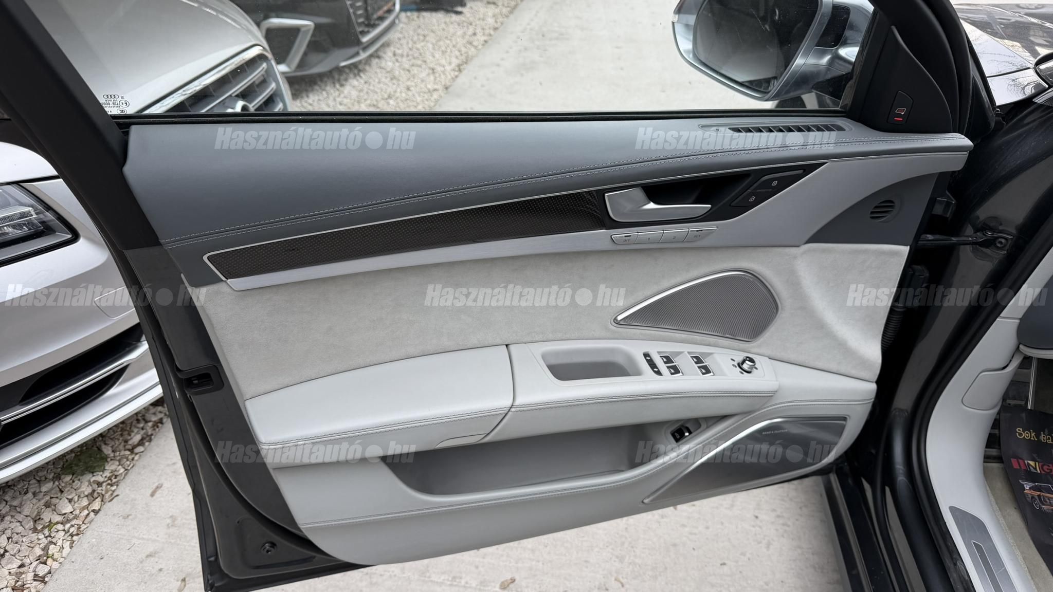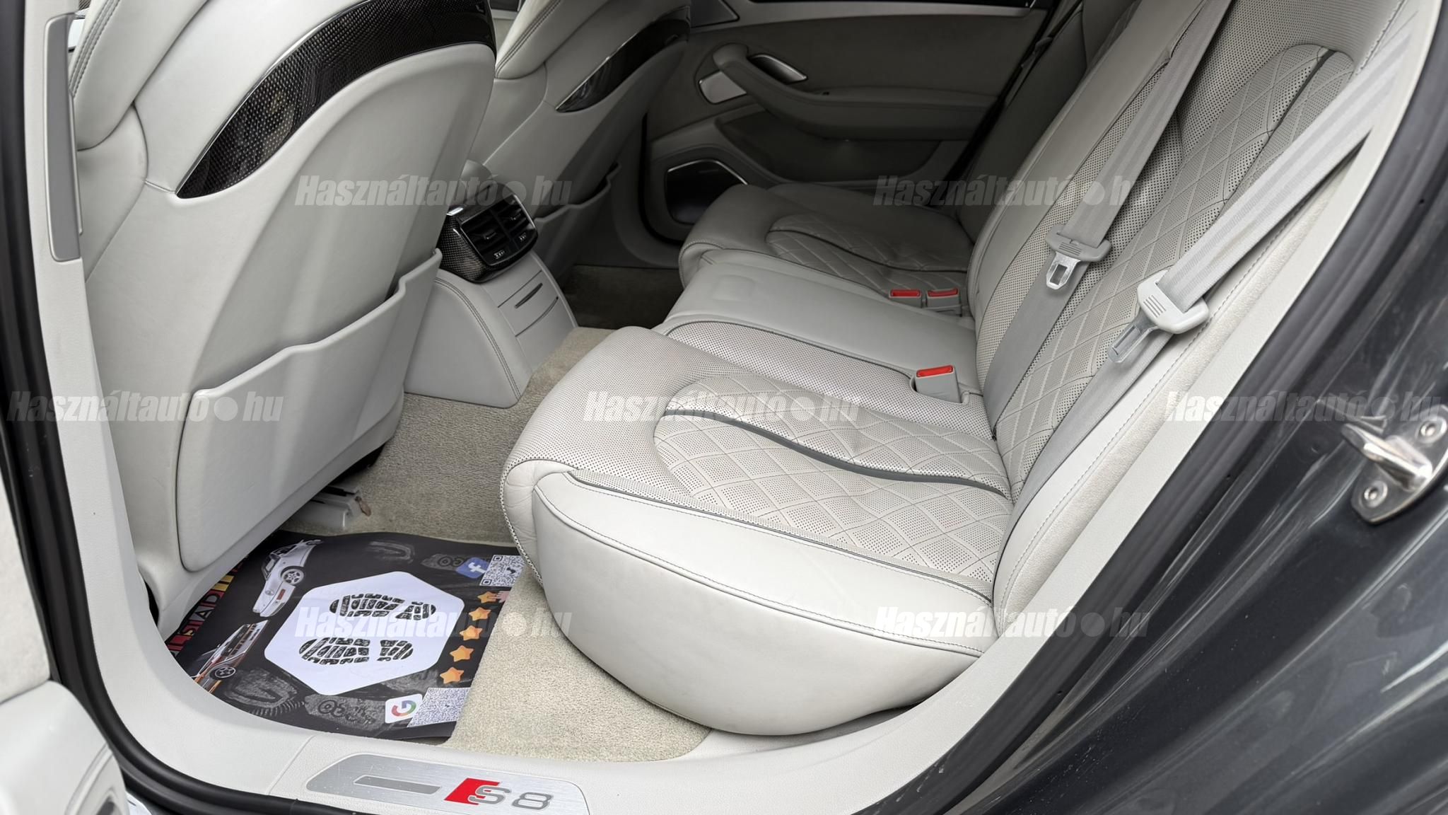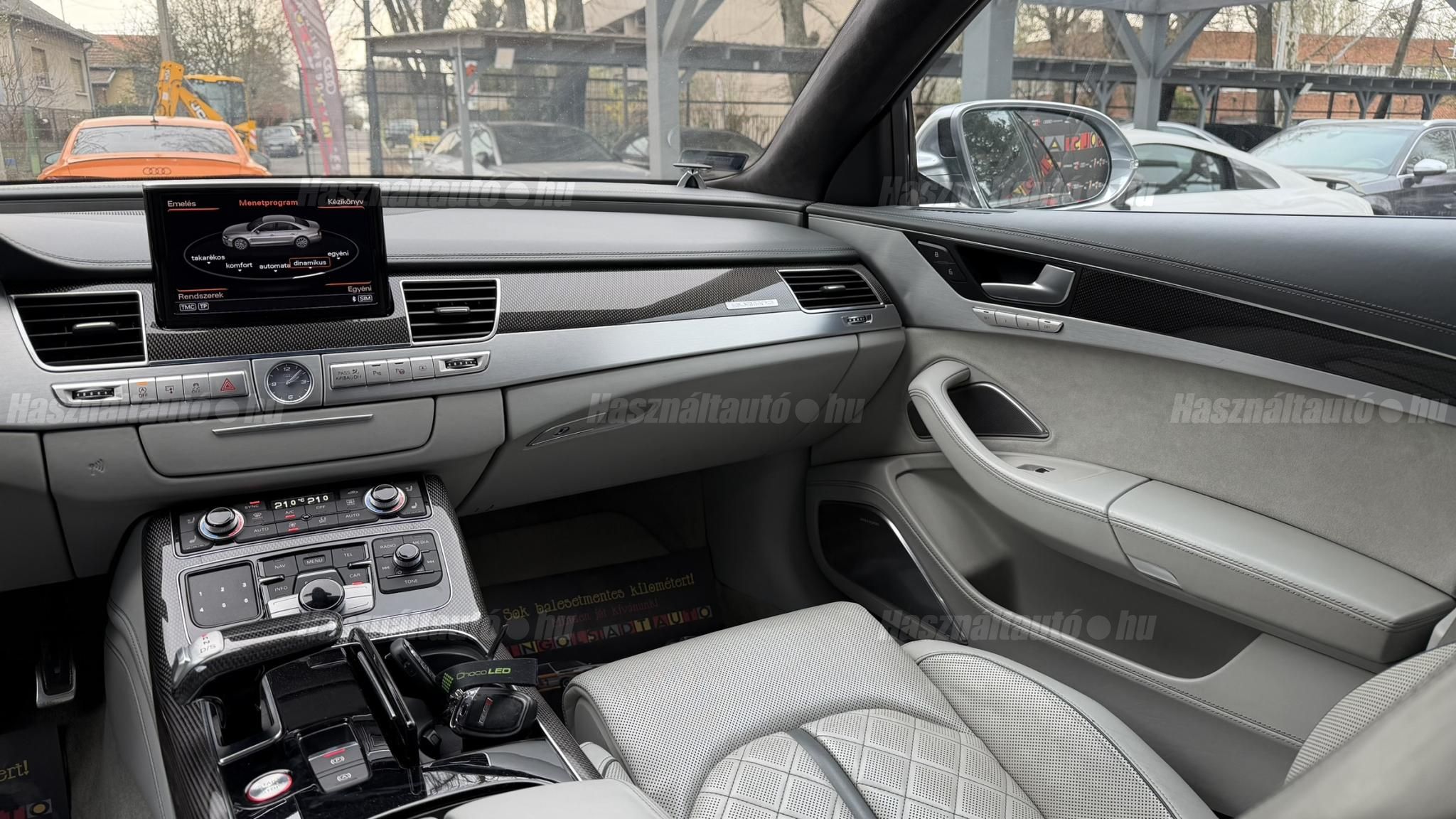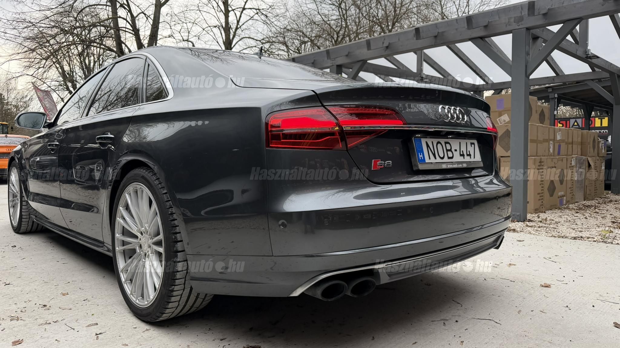 További 50 nagy felbontású kép: facebook/ingolstadtauto oldalunkon! AZ AUTÓK MEGTEKINTÉSÉHEZ MINDEN ESETBEN ELŐZETES TELEFONOS EGYEZTETÉS SZÜKSÉGES! BANKI HITELÜGYINTÉZÉSben is tudunk segíteni ez 12-84 hónapig terjedő periódusra ütemezhető. Legalább 20% önrésszel vehető fel.----------TÍPUS/ÁLLAPOT----------AZ ADOTT AUTÓRÓL:Gyönyörű Daytona Grau színű, sportos luxuslimuzin. Vezetett szervizkönyves. 2016/01-ben egy márkaszervizes visszahíváson vett részt, ahol az autót teljes körűen átvizsgálták. A turbók és a vezérlés is rendben vannak.Teljesen törésmentes, a fényezése szép, mindenhol egységes.A típusból kétféle változat készült: egy 520 lóerős alapverzió, illetve egy 605 lóerős Plus kivitel. Jelentős műszaki különbség nincs közöttük, a turbók, a motor és a váltó is azonos. Mindkét verzió egy STAGE 1 programmal kb. 680 lóerő / 900 Nm teljesítményre módosítható. Ez az S8 is ilyen STAGE 1 programmal kerül átadásra.A beltér megkímélt állapotú, nincsenek benne megmagyarázhatatlan, barbár sérülések. A szellőztethető, fűthető és masszázsfunkciós komfortülések az Audi egyik legkényelmesebb ülései közé tartoznak. Minden irányban elektromosan állíthatók (deréktámasz, oldaltartás, vállrész), így maximális kényelmet biztosítanak.A beltérben többféle anyag és szín találkozik, mégis tökéletes harmóniát alkotnak. Az autót Carbon csomaggal rendelték, így a luxus megjelenés mellett a sportosság is hangsúlyos.Nagyon sok extra található benne, ezeket a videóban részletesen bemutatjuk.Szerkezetileg és motorikusan hibátlan, minden extra tökéletesen működik.A 21 colos, préseléssel kovácsolt Axe felnik jó állapotúak, minimális sérülések láthatók rajtuk. Jelenleg jó állapotú Hankook nyári gumikkal szerelt.A kerámia fékrendszer állapota jó, a fékbetétek még nincsenek kopásjelzőn.Minden tartozék rendelkezésre áll: összes gyári dokumentáció, vezetett szervizkönyv, valamint 2 db eredeti kulcs.A TÍPUSRÓL: Larry, mondd el Vincentnek, mire van szükséged! Valami nagyon gyors kell. Egy Audi S8-as. Olyan, ami odalép… ha kell./Ronin/Az Audi S8 ikonikus modell lett nemcsak gyors, hanem harcra kész is volt, és a filmjelenet sokunkban maradandó élményt hagyott.Az Audi legnagyobb luxuslimuzinja, amelyben tökéletesen ötvöződik a sportosság, a kényelem és a luxus. Nemrég mentem vele egy kört pályán állapotfelmérés keretében, és még mindig megvan a respektje az utakon megjelenése mai szemmel is tiszteletet parancsoló.Ez az Audi S8 D4 facelift egy 4.0 literes, V8 biturbó motorral szerelt csúcsmodell, amely ebben a kivitelben 520 lóerőt és 650 Nm nyomatékot kínál.A motorhoz az Audi egyik legmegbízhatóbb, 8 fokozatú tiptronic automata váltója, valamint az állandó quattro összkerékhajtás társul, amely kiemelkedő stabilitást és tapadást biztosít.A V8-as motor karaktere lineáris és rendkívül kifinomult: alacsony fordulaton nyomatékos, magasabb tartományban pedig sportosan húz, mindezt szinte késlekedés nélkül. A turbók a hengersorok között helyezkednek el (hot V kialakítás), ami gyorsabb reakciót és hatékonyabb működést eredményez.A konstrukció különlegessége, hogy a nagy teljesítmény ellenére a hengerlekapcsolásos rendszernek (COD) köszönhetően képes gazdaságosabban is üzemelni.Gyári fogyasztási adatok:Városi fogyasztás: 13.6l/100kmOrszágúti fogyasztás: 7.3l/100kmVegyes fogyasztás: 9.6l/100km----------EXTRÁK----------4x ülésfűtésKormányfűtésVezetéstámogató rendszer: Sávváltó és sávtartó asszisztens (Side Assist és aktív sávtartó asszisztens) beleértve a z első és hátsó érzékelőketKipörgésgátló rendszer (ASR)Hátsó ablakok sötétítettek, beleértve a dupla üvegezéstMMI Touch (Érintőképernyő)Audi zenei interfaceMultimédia interfész MMIUniverzális Bluetooth csatlakozóAdaptív féklámpaAktív zajszűrés (ANC)Ambient világításRádió kiegészítő: Audi zenei interfészAutomatikus légkeringés-szabályozásKülső és belső világítási csomagKülső világítási csomagAszférikus külső tükör, balKülső aszferikus tükör, jobbLED irányjelzők az oldaltükrökben integrálvaFékrendszer visszanyerési rendszerrelLopásvédelem a kerekekhez (kerékzárak)Ajtó küszöbvédők monogrammalHátsó üléssor elrendezése Csomagtér csomagAutomata sebességváltó - Tiptronic (8 sebességes)Hátsó pohártartóPohártartó a középső konzolbanBelső felszerelés szénszálas befejező betétekkelBelső felszerelés: Betétek alsó befejezéssel Csiszolt alumíniumBelső kialakítás: kibővített alumínium hatásBelső visszapillantó tükör automatikus vakításgátló rendszerrelKarosszéria: 4 ajtóElülső Comfort sportülés csomagTeljes bőr csomagAlcantara csomagElektromosan állítható szervó (kormánykerék)Megvilágított sminktükörElektromechanikus kézifékPótkerék mint vészkerekKörnyezetvédelmi rendszer Euro 6 szabványBőr sebességváltókarAutomatikus ajtózárÜléshűtés és masszázsfunkció elölÜléshuzat / kárpitozás: Alcantara / Valcona bőrSpeciális festés Daytona GrauHangrendszer Bang&OlufsenElektromos napellenző redőny a hátsó ablakonNapellenző redőny a hátsó ablakon és a hátsó oldalsó ablakon elektromosan.Gumikontroll mutatóÉjjellátó360-as kameraAudi Matrix LED fényszórókVezetéstámogató rendszer: Sebességkorlát jelzőLED hátsó lámpákFékasszisztensElülső középső kartámasz Kényelmi felszerelésAutomatikus csomagtérajtó nyitásCsomagtér-ajtó zárássegítőFény- és esőérzékelőSport kipufogó rendszerElektromosan állítható, fűthető és behajtható külső tükrök automatikus sötétítéssel és járdafunkcióvalKülső tükör automata járdaparkolással, jobbElektromosan állítható külső tükrök, memór