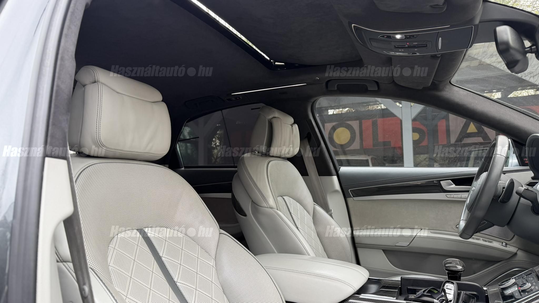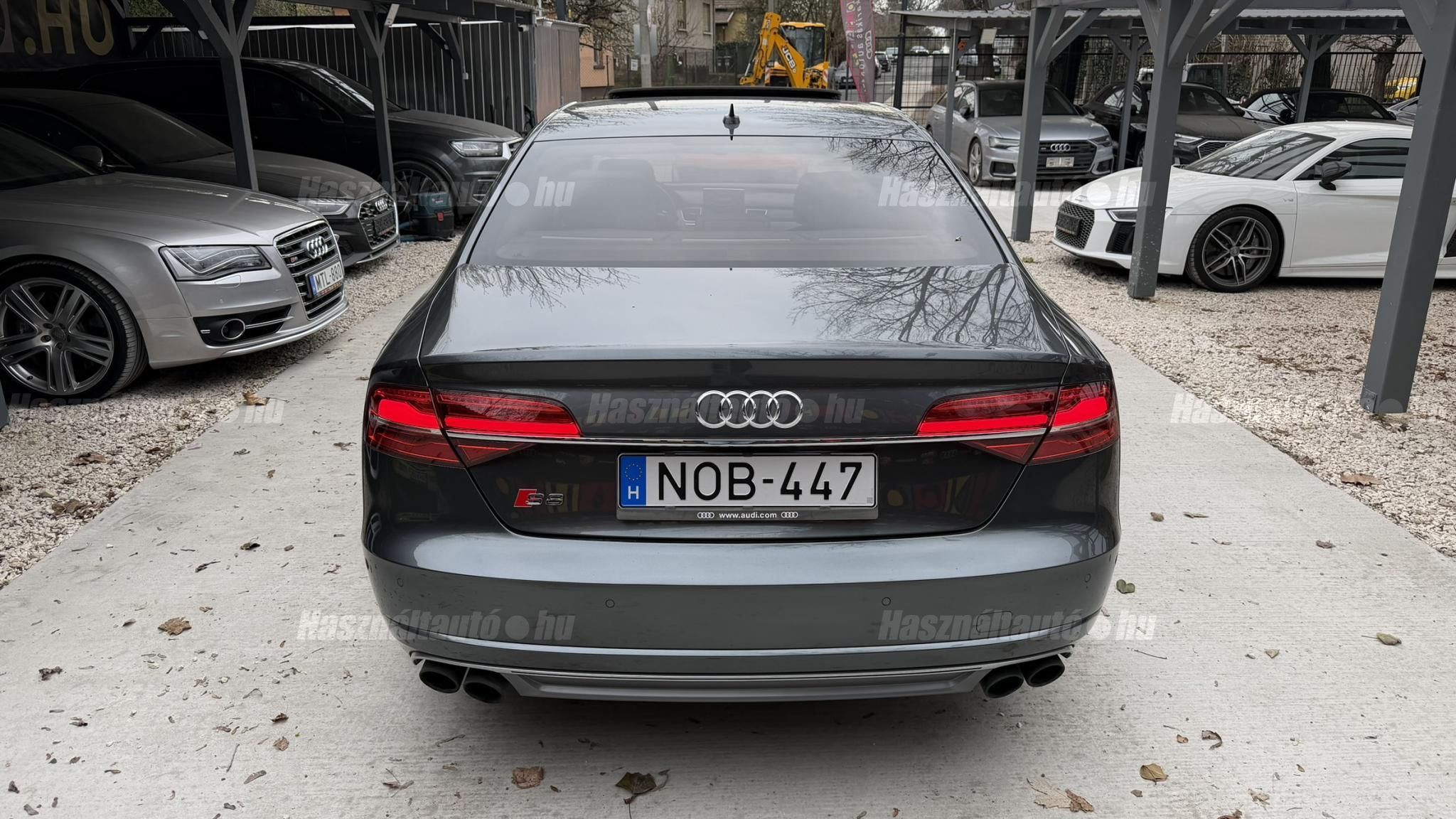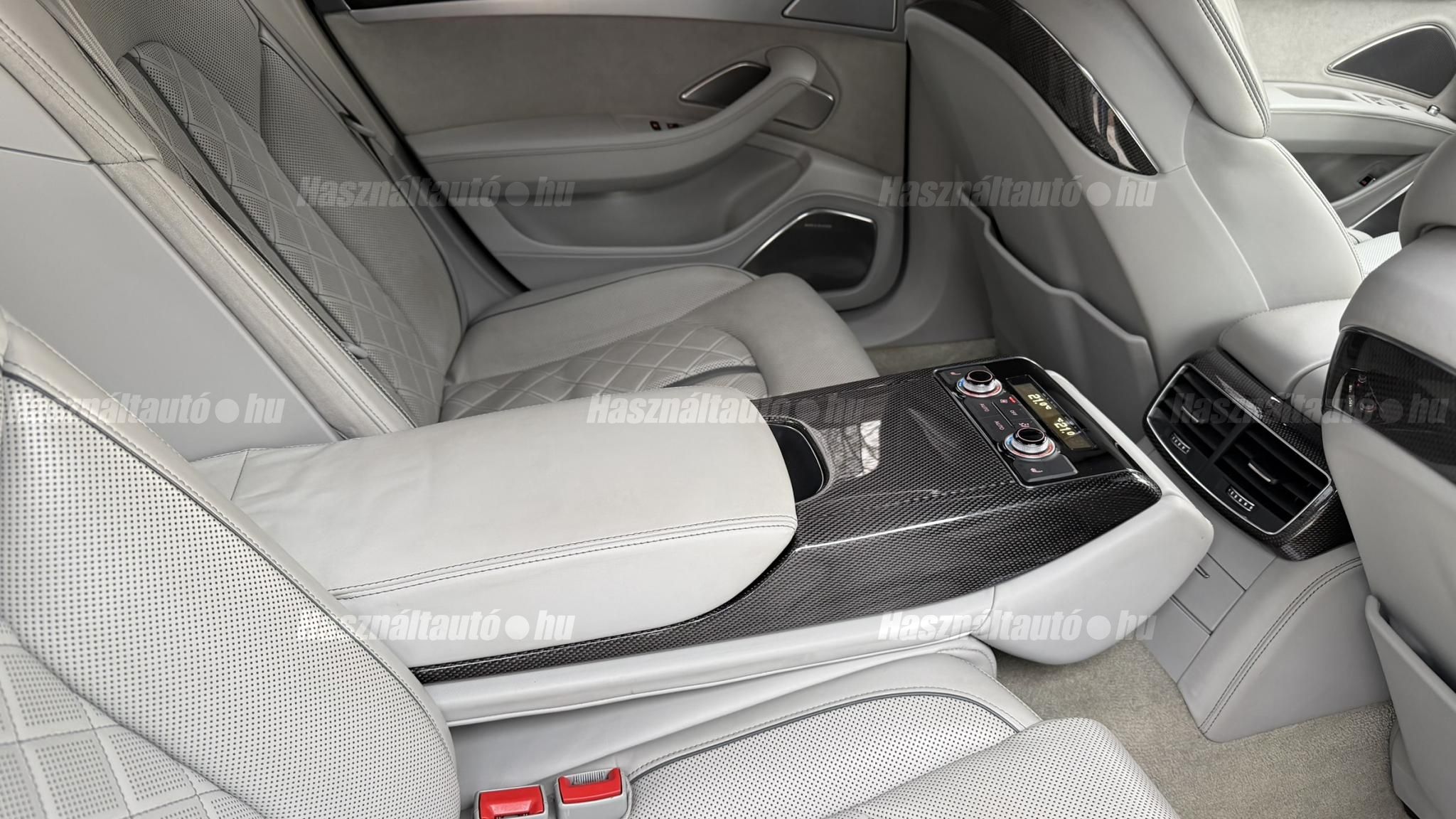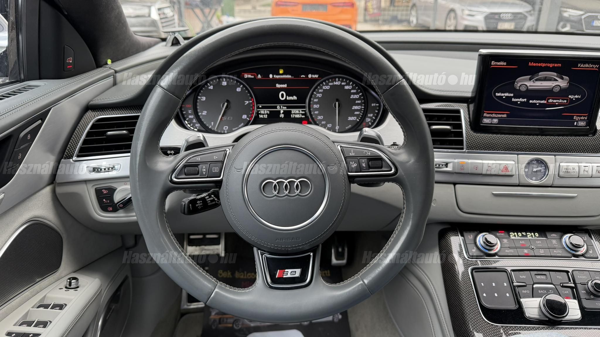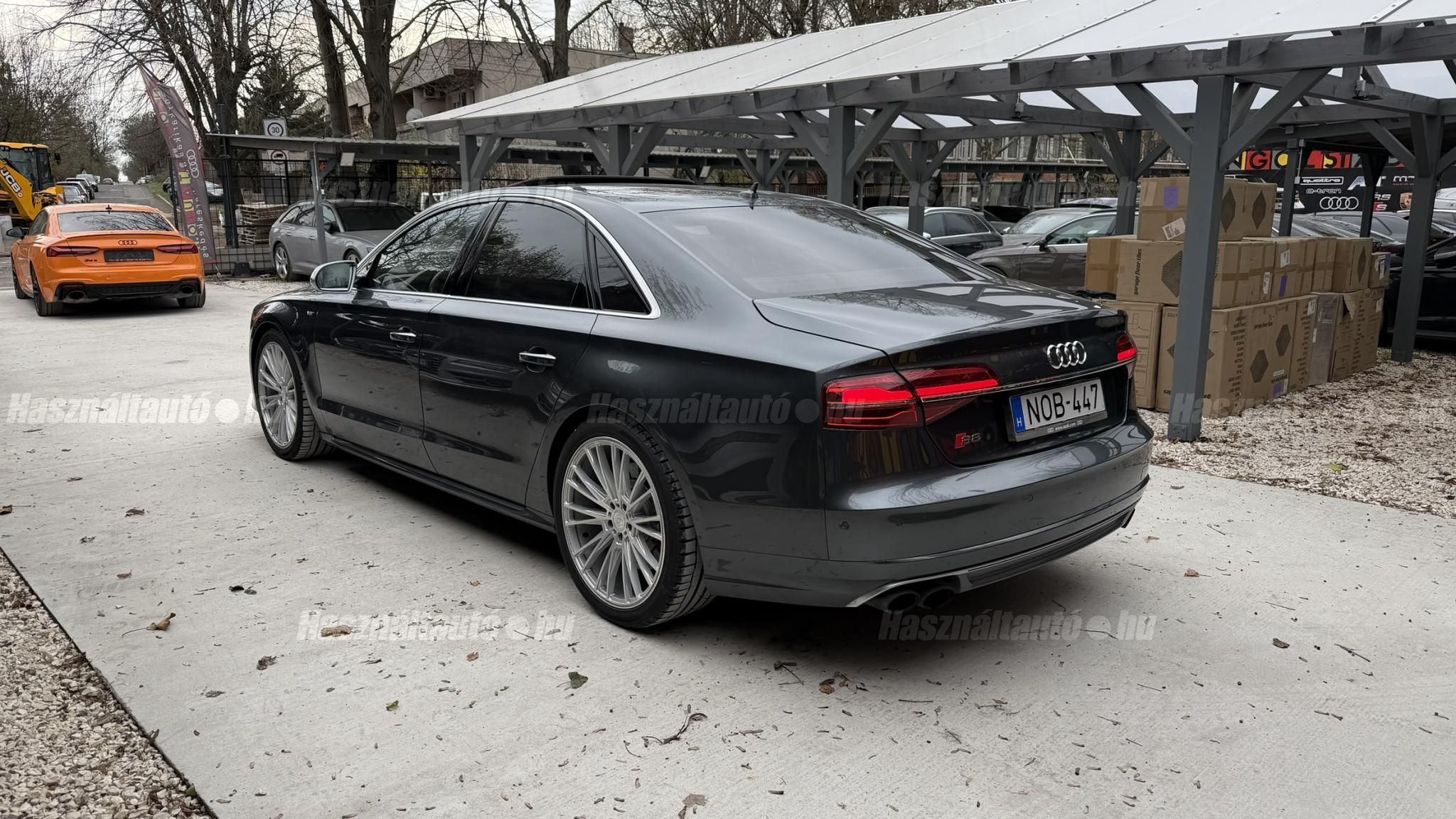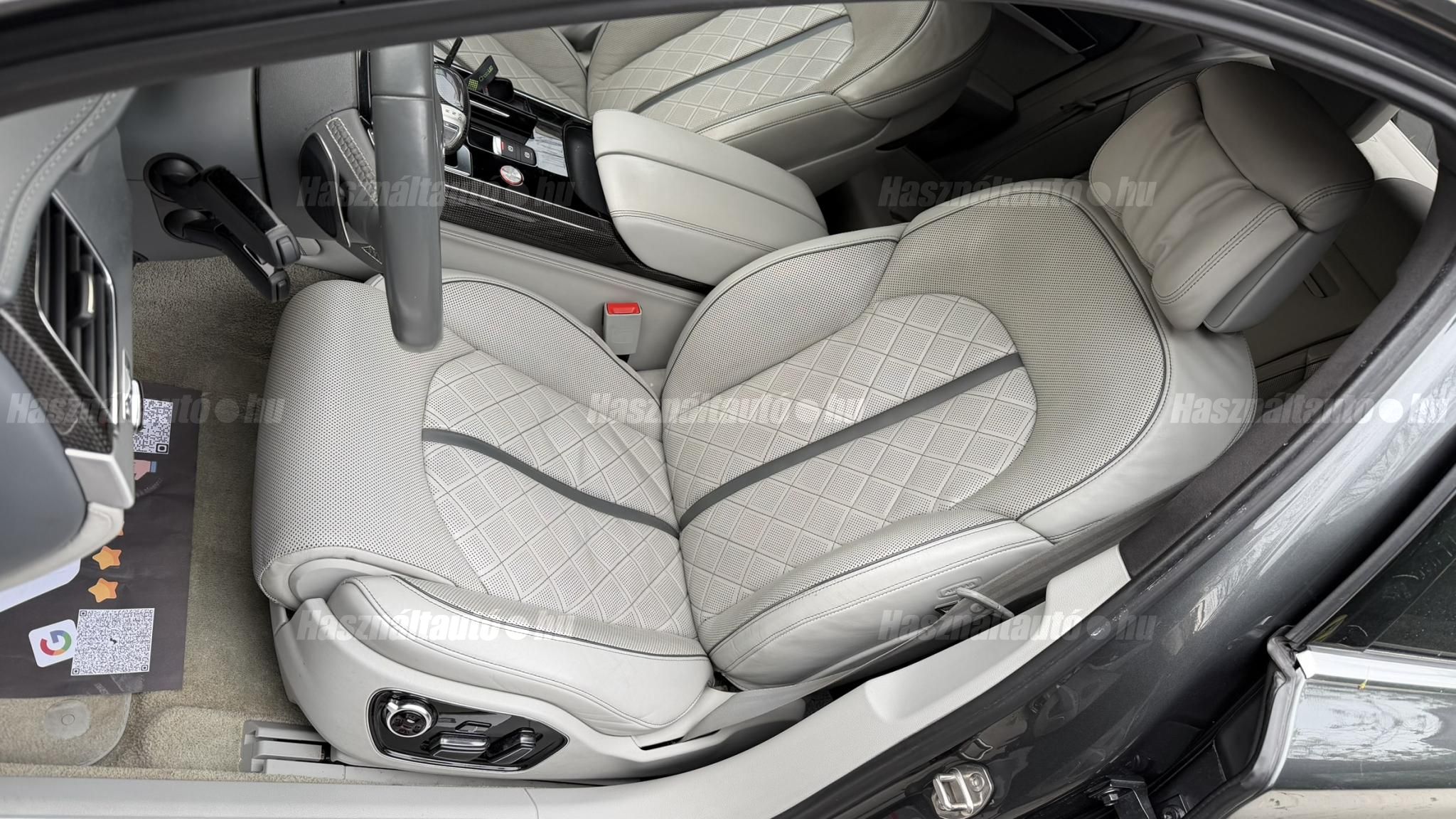 További 50 nagy felbontású kép: facebook/ingolstadtauto oldalunkon! AZ AUTÓK MEGTEKINTÉSÉHEZ MINDEN ESETBEN ELŐZETES TELEFONOS EGYEZTETÉS SZÜKSÉGES! BANKI HITELÜGYINTÉZÉSben is tudunk segíteni ez 12-84 hónapig terjedő periódusra ütemezhető. Legalább 20% önrésszel vehető fel.----------TÍPUS/ÁLLAPOT----------AZ ADOTT AUTÓRÓL:Gyönyörű Daytona Grau színű, sportos luxuslimuzin. Vezetett szervizkönyves. 2016/01-ben egy márkaszervizes visszahíváson vett részt, ahol az autót teljes körűen átvizsgálták. A turbók és a vezérlés is rendben vannak.Teljesen törésmentes, a fényezése szép, mindenhol egységes.A típusból kétféle változat készült: egy 520 lóerős alapverzió, illetve egy 605 lóerős Plus kivitel. Jelentős műszaki különbség nincs közöttük, a turbók, a motor és a váltó is azonos. Mindkét verzió egy STAGE 1 programmal kb. 680 lóerő / 900 Nm teljesítményre módosítható. Ez az S8 is ilyen STAGE 1 programmal kerül átadásra.A beltér megkímélt állapotú, nincsenek benne megmagyarázhatatlan, barbár sérülések. A szellőztethető, fűthető és masszázsfunkciós komfortülések az Audi egyik legkényelmesebb ülései közé tartoznak. Minden irányban elektromosan állíthatók (deréktámasz, oldaltartás, vállrész), így maximális kényelmet biztosítanak.A beltérben többféle anyag és szín találkozik, mégis tökéletes harmóniát alkotnak. Az autót Carbon csomaggal rendelték, így a luxus megjelenés mellett a sportosság is hangsúlyos.Nagyon sok extra található benne, ezeket a videóban részletesen bemutatjuk.Szerkezetileg és motorikusan hibátlan, minden extra tökéletesen működik.A 21 colos, préseléssel kovácsolt Axe felnik jó állapotúak, minimális sérülések láthatók rajtuk. Jelenleg jó állapotú Hankook nyári gumikkal szerelt.A kerámia fékrendszer állapota jó, a fékbetétek még nincsenek kopásjelzőn.Minden tartozék rendelkezésre áll: összes gyári dokumentáció, vezetett szervizkönyv, valamint 2 db eredeti kulcs.A TÍPUSRÓL: Larry, mondd el Vincentnek, mire van szükséged! Valami nagyon gyors kell. Egy Audi S8-as. Olyan, ami odalép… ha kell./Ronin/Az Audi S8 ikonikus modell lett nemcsak gyors, hanem harcra kész is volt, és a filmjelenet sokunkban maradandó élményt hagyott.Az Audi legnagyobb luxuslimuzinja, amelyben tökéletesen ötvöződik a sportosság, a kényelem és a luxus. Nemrég mentem vele egy kört pályán állapotfelmérés keretében, és még mindig megvan a respektje az utakon megjelenése mai szemmel is tiszteletet parancsoló.Ez az Audi S8 D4 facelift egy 4.0 literes, V8 biturbó motorral szerelt csúcsmodell, amely ebben a kivitelben 520 lóerőt és 650 Nm nyomatékot kínál.A motorhoz az Audi egyik legmegbízhatóbb, 8 fokozatú tiptronic automata váltója, valamint az állandó quattro összkerékhajtás társul, amely kiemelkedő stabilitást és tapadást biztosít.A V8-as motor karaktere lineáris és rendkívül kifinomult: alacsony fordulaton nyomatékos, magasabb tartományban pedig sportosan húz, mindezt szinte késlekedés nélkül. A turbók a hengersorok között helyezkednek el (hot V kialakítás), ami gyorsabb reakciót és hatékonyabb működést eredményez.A konstrukció különlegessége, hogy a nagy teljesítmény ellenére a hengerlekapcsolásos rendszernek (COD) köszönhetően képes gazdaságosabban is üzemelni.Gyári fogyasztási adatok:Városi fogyasztás: 13.6l/100kmOrszágúti fogyasztás: 7.3l/100kmVegyes fogyasztás: 9.6l/100km----------EXTRÁK----------4x ülésfűtésKormányfűtésVezetéstámogató rendszer: Sávváltó és sávtartó asszisztens (Side Assist és aktív sávtartó asszisztens) beleértve a z első és hátsó érzékelőketKipörgésgátló rendszer (ASR)Hátsó ablakok sötétítettek, beleértve a dupla üvegezéstMMI Touch (Érintőképernyő)Audi zenei interfaceMultimédia interfész MMIUniverzális Bluetooth csatlakozóAdaptív féklámpaAktív zajszűrés (ANC)Ambient világításRádió kiegészítő: Audi zenei interfészAutomatikus légkeringés-szabályozásKülső és belső világítási csomagKülső világítási csomagAszférikus külső tükör, balKülső aszferikus tükör, jobbLED irányjelzők az oldaltükrökben integrálvaFékrendszer visszanyerési rendszerrelLopásvédelem a kerekekhez (kerékzárak)Ajtó küszöbvédők monogrammalHátsó üléssor elrendezése Csomagtér csomagAutomata sebességváltó - Tiptronic (8 sebességes)Hátsó pohártartóPohártartó a középső konzolbanBelső felszerelés szénszálas befejező betétekkelBelső felszerelés: Betétek alsó befejezéssel Csiszolt alumíniumBelső kialakítás: kibővített alumínium hatásBelső visszapillantó tükör automatikus vakításgátló rendszerrelKarosszéria: 4 ajtóElülső Comfort sportülés csomagTeljes bőr csomagAlcantara csomagElektromosan állítható szervó (kormánykerék)Megvilágított sminktükörElektromechanikus kézifékPótkerék mint vészkerekKörnyezetvédelmi rendszer Euro 6 szabványBőr sebességváltókarAutomatikus ajtózárÜléshűtés és masszázsfunkció elölÜléshuzat / kárpitozás: Alcantara / Valcona bőrSpeciális festés Daytona GrauHangrendszer Bang&OlufsenElektromos napellenző redőny a hátsó ablakonNapellenző redőny a hátsó ablakon és a hátsó oldalsó ablakon elektromosan.Gumikontroll mutatóÉjjellátó360-as kameraAudi Matrix LED fényszórókVezetéstámogató rendszer: Sebességkorlát jelzőLED hátsó lámpákFékasszisztensElülső középső kartámasz Kényelmi felszerelésAutomatikus csomagtérajtó nyitásCsomagtér-ajtó zárássegítőFény- és esőérzékelőSport kipufogó rendszerElektromosan állítható, fűthető és behajtható külső tükrök automatikus sötétítéssel és járdafunkcióvalKülső tükör automata járdaparkolással, jobbElektromosan állítható külső tükrök, memór