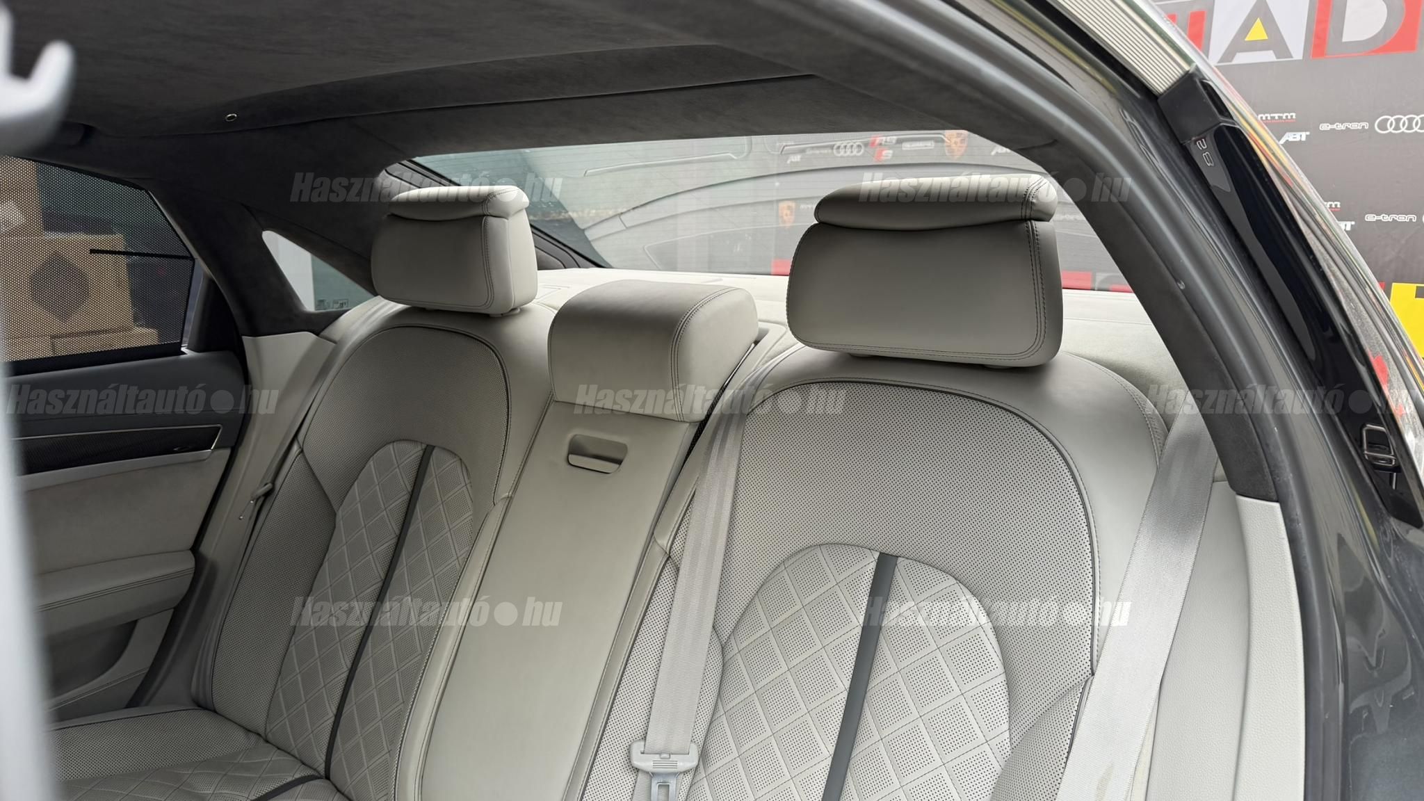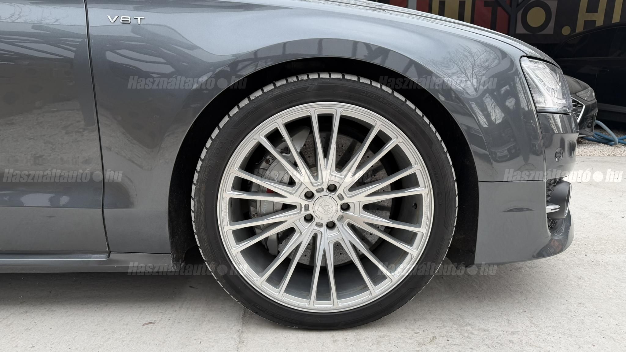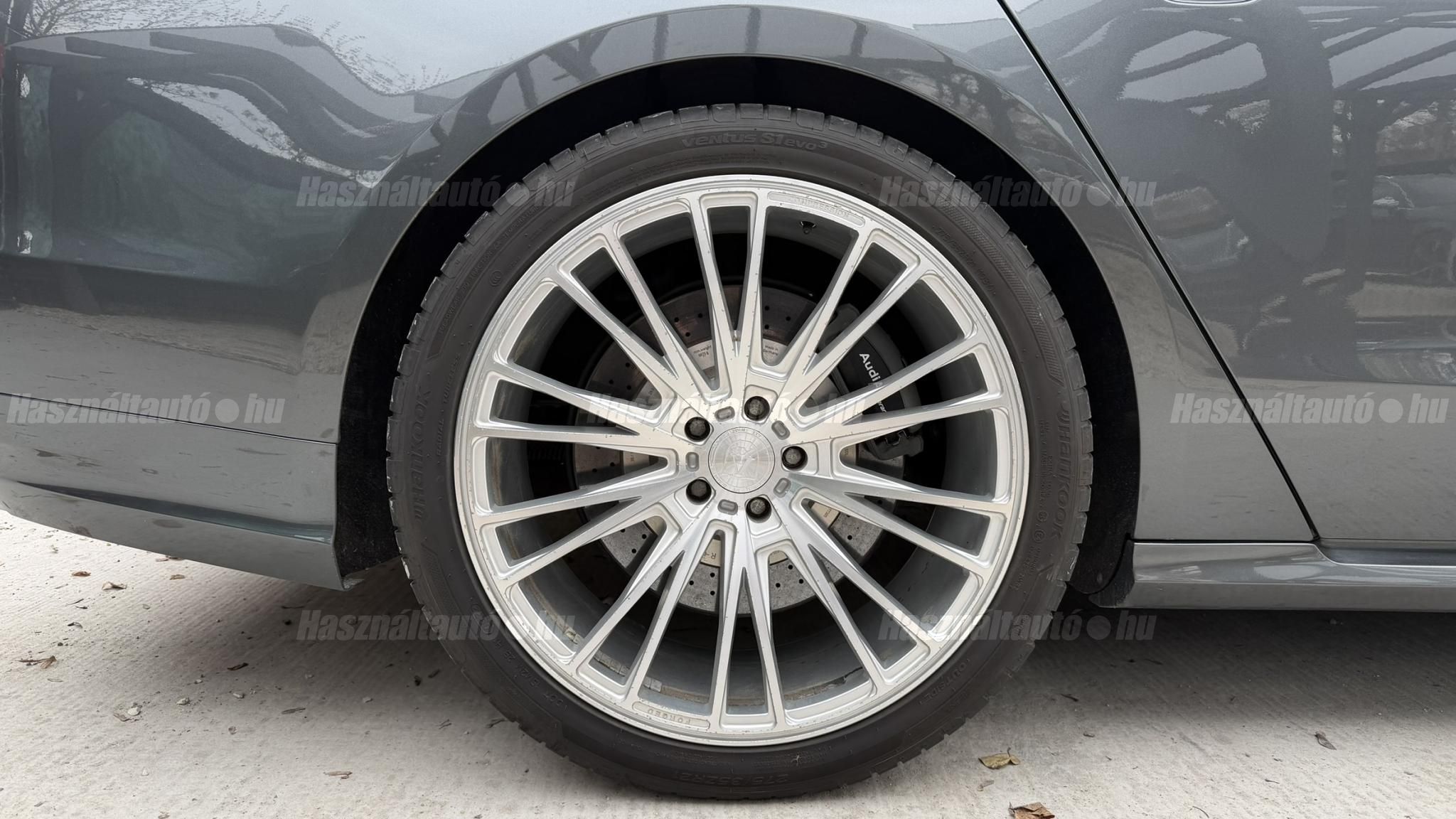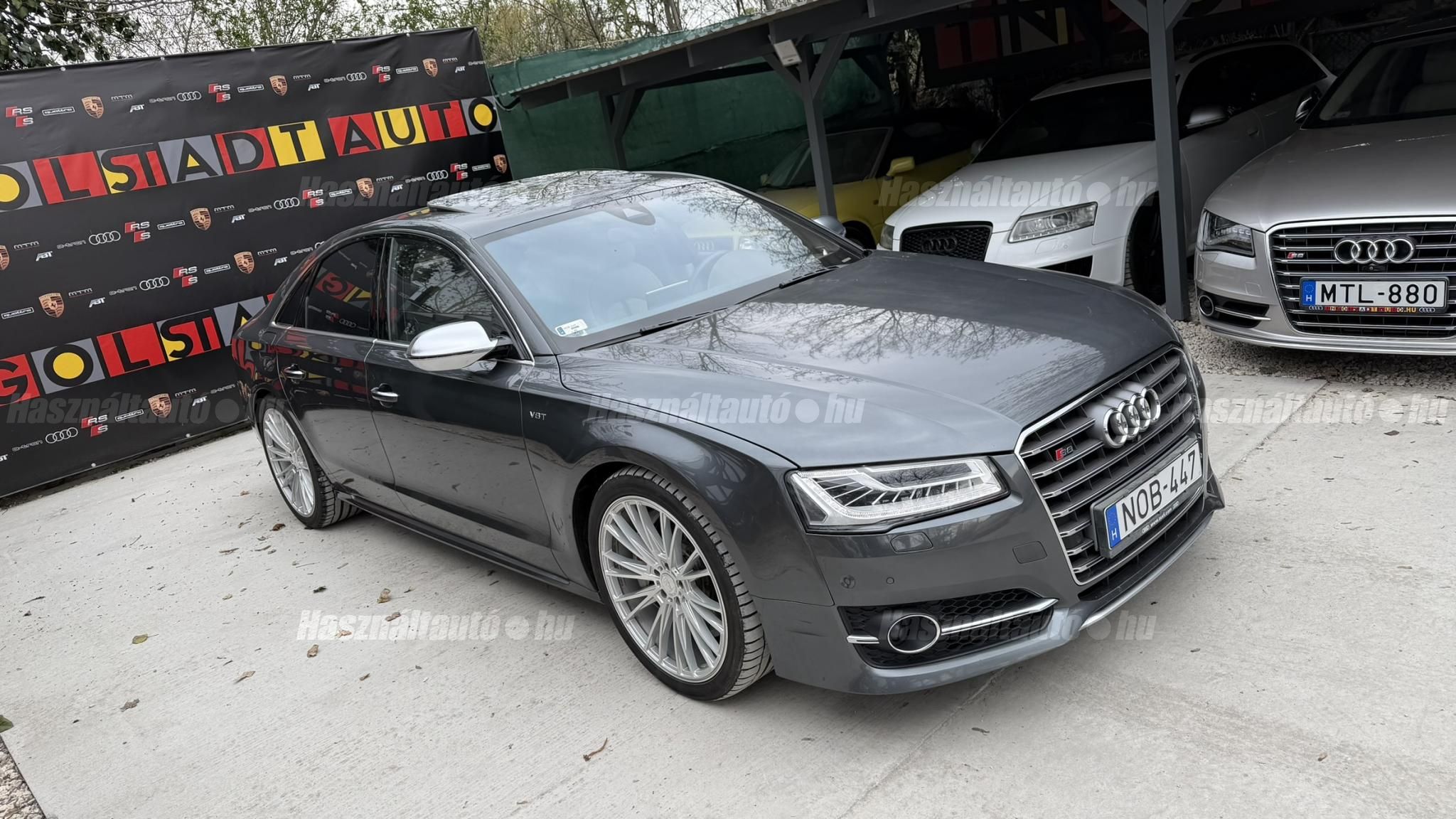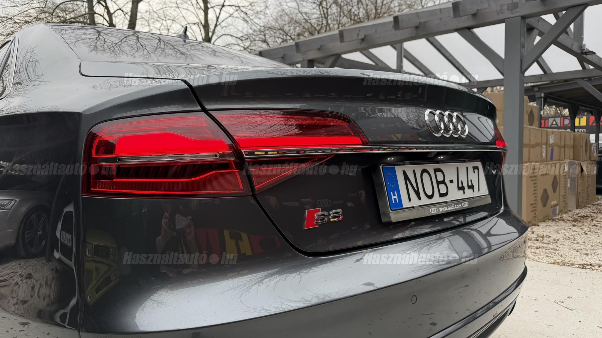 További 50 nagy felbontású kép: facebook/ingolstadtauto oldalunkon! AZ AUTÓK MEGTEKINTÉSÉHEZ MINDEN ESETBEN ELŐZETES TELEFONOS EGYEZTETÉS SZÜKSÉGES! BANKI HITELÜGYINTÉZÉSben is tudunk segíteni ez 12-84 hónapig terjedő periódusra ütemezhető. Legalább 20% önrésszel vehető fel.----------TÍPUS/ÁLLAPOT----------AZ ADOTT AUTÓRÓL:Gyönyörű Daytona Grau színű, sportos luxuslimuzin. Vezetett szervizkönyves. 2016/01-ben egy márkaszervizes visszahíváson vett részt, ahol az autót teljes körűen átvizsgálták. A turbók és a vezérlés is rendben vannak.Teljesen törésmentes, a fényezése szép, mindenhol egységes.A típusból kétféle változat készült: egy 520 lóerős alapverzió, illetve egy 605 lóerős Plus kivitel. Jelentős műszaki különbség nincs közöttük, a turbók, a motor és a váltó is azonos. Mindkét verzió egy STAGE 1 programmal kb. 680 lóerő / 900 Nm teljesítményre módosítható. Ez az S8 is ilyen STAGE 1 programmal kerül átadásra.A beltér megkímélt állapotú, nincsenek benne megmagyarázhatatlan, barbár sérülések. A szellőztethető, fűthető és masszázsfunkciós komfortülések az Audi egyik legkényelmesebb ülései közé tartoznak. Minden irányban elektromosan állíthatók (deréktámasz, oldaltartás, vállrész), így maximális kényelmet biztosítanak.A beltérben többféle anyag és szín találkozik, mégis tökéletes harmóniát alkotnak. Az autót Carbon csomaggal rendelték, így a luxus megjelenés mellett a sportosság is hangsúlyos.Nagyon sok extra található benne, ezeket a videóban részletesen bemutatjuk.Szerkezetileg és motorikusan hibátlan, minden extra tökéletesen működik.A 21 colos, préseléssel kovácsolt Axe felnik jó állapotúak, minimális sérülések láthatók rajtuk. Jelenleg jó állapotú Hankook nyári gumikkal szerelt.A kerámia fékrendszer állapota jó, a fékbetétek még nincsenek kopásjelzőn.Minden tartozék rendelkezésre áll: összes gyári dokumentáció, vezetett szervizkönyv, valamint 2 db eredeti kulcs.A TÍPUSRÓL: Larry, mondd el Vincentnek, mire van szükséged! Valami nagyon gyors kell. Egy Audi S8-as. Olyan, ami odalép… ha kell./Ronin/Az Audi S8 ikonikus modell lett nemcsak gyors, hanem harcra kész is volt, és a filmjelenet sokunkban maradandó élményt hagyott.Az Audi legnagyobb luxuslimuzinja, amelyben tökéletesen ötvöződik a sportosság, a kényelem és a luxus. Nemrég mentem vele egy kört pályán állapotfelmérés keretében, és még mindig megvan a respektje az utakon megjelenése mai szemmel is tiszteletet parancsoló.Ez az Audi S8 D4 facelift egy 4.0 literes, V8 biturbó motorral szerelt csúcsmodell, amely ebben a kivitelben 520 lóerőt és 650 Nm nyomatékot kínál.A motorhoz az Audi egyik legmegbízhatóbb, 8 fokozatú tiptronic automata váltója, valamint az állandó quattro összkerékhajtás társul, amely kiemelkedő stabilitást és tapadást biztosít.A V8-as motor karaktere lineáris és rendkívül kifinomult: alacsony fordulaton nyomatékos, magasabb tartományban pedig sportosan húz, mindezt szinte késlekedés nélkül. A turbók a hengersorok között helyezkednek el (hot V kialakítás), ami gyorsabb reakciót és hatékonyabb működést eredményez.A konstrukció különlegessége, hogy a nagy teljesítmény ellenére a hengerlekapcsolásos rendszernek (COD) köszönhetően képes gazdaságosabban is üzemelni.Gyári fogyasztási adatok:Városi fogyasztás: 13.6l/100kmOrszágúti fogyasztás: 7.3l/100kmVegyes fogyasztás: 9.6l/100km----------EXTRÁK----------4x ülésfűtésKormányfűtésVezetéstámogató rendszer: Sávváltó és sávtartó asszisztens (Side Assist és aktív sávtartó asszisztens) beleértve a z első és hátsó érzékelőketKipörgésgátló rendszer (ASR)Hátsó ablakok sötétítettek, beleértve a dupla üvegezéstMMI Touch (Érintőképernyő)Audi zenei interfaceMultimédia interfész MMIUniverzális Bluetooth csatlakozóAdaptív féklámpaAktív zajszűrés (ANC)Ambient világításRádió kiegészítő: Audi zenei interfészAutomatikus légkeringés-szabályozásKülső és belső világítási csomagKülső világítási csomagAszférikus külső tükör, balKülső aszferikus tükör, jobbLED irányjelzők az oldaltükrökben integrálvaFékrendszer visszanyerési rendszerrelLopásvédelem a kerekekhez (kerékzárak)Ajtó küszöbvédők monogrammalHátsó üléssor elrendezése Csomagtér csomagAutomata sebességváltó - Tiptronic (8 sebességes)Hátsó pohártartóPohártartó a középső konzolbanBelső felszerelés szénszálas befejező betétekkelBelső felszerelés: Betétek alsó befejezéssel Csiszolt alumíniumBelső kialakítás: kibővített alumínium hatásBelső visszapillantó tükör automatikus vakításgátló rendszerrelKarosszéria: 4 ajtóElülső Comfort sportülés csomagTeljes bőr csomagAlcantara csomagElektromosan állítható szervó (kormánykerék)Megvilágított sminktükörElektromechanikus kézifékPótkerék mint vészkerekKörnyezetvédelmi rendszer Euro 6 szabványBőr sebességváltókarAutomatikus ajtózárÜléshűtés és masszázsfunkció elölÜléshuzat / kárpitozás: Alcantara / Valcona bőrSpeciális festés Daytona GrauHangrendszer Bang&OlufsenElektromos napellenző redőny a hátsó ablakonNapellenző redőny a hátsó ablakon és a hátsó oldalsó ablakon elektromosan.Gumikontroll mutatóÉjjellátó360-as kameraAudi Matrix LED fényszórókVezetéstámogató rendszer: Sebességkorlát jelzőLED hátsó lámpákFékasszisztensElülső középső kartámasz Kényelmi felszerelésAutomatikus csomagtérajtó nyitásCsomagtér-ajtó zárássegítőFény- és esőérzékelőSport kipufogó rendszerElektromosan állítható, fűthető és behajtható külső tükrök automatikus sötétítéssel és járdafunkcióvalKülső tükör automata járdaparkolással, jobbElektromosan állítható külső tükrök, memór