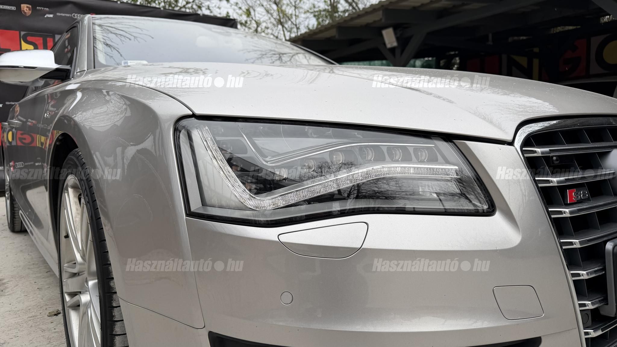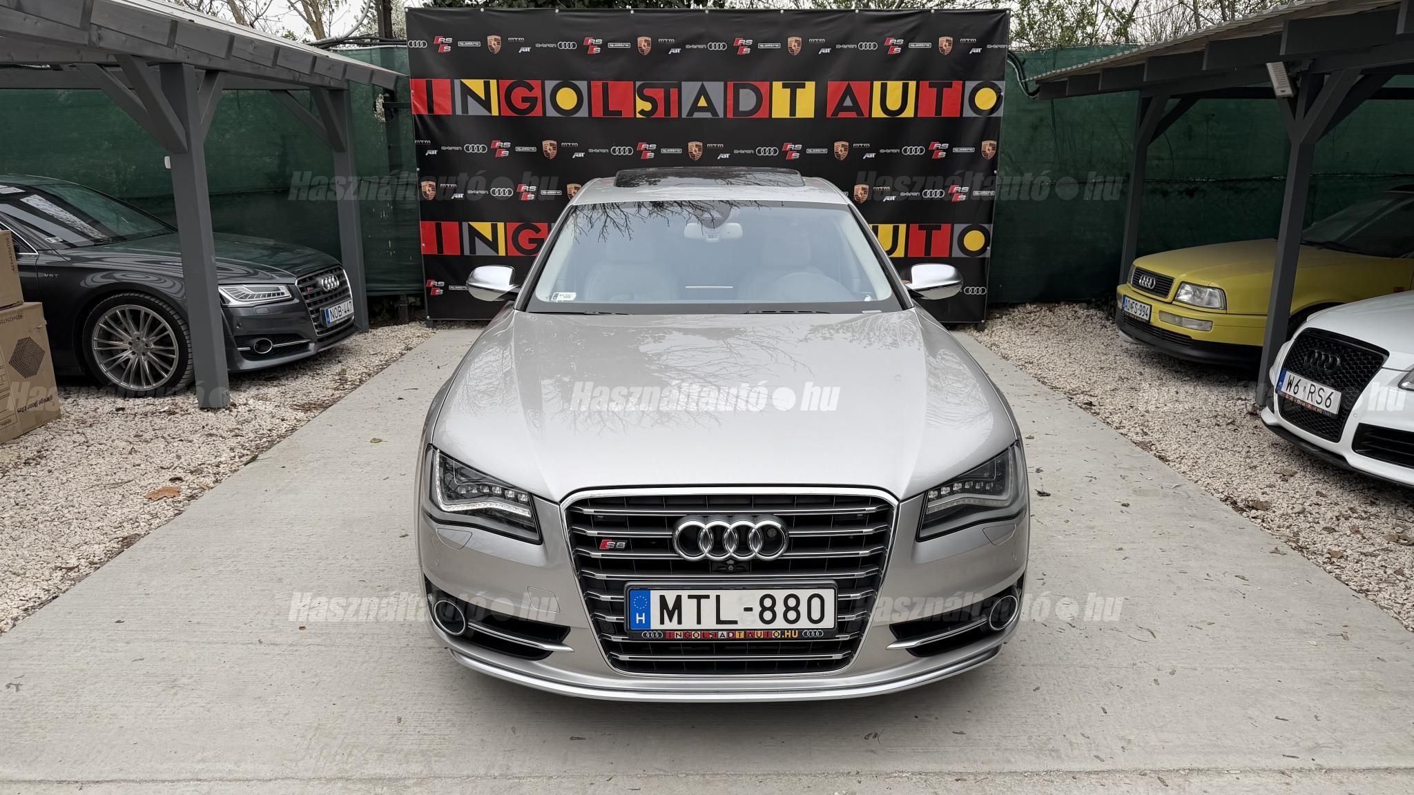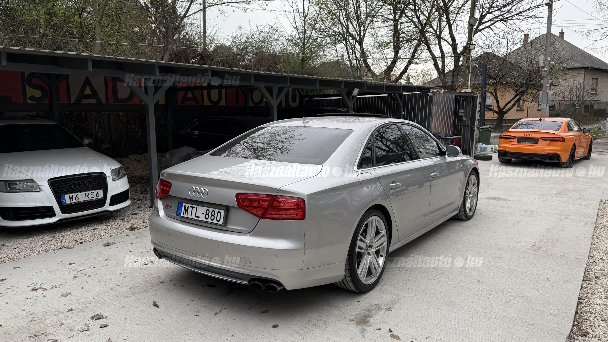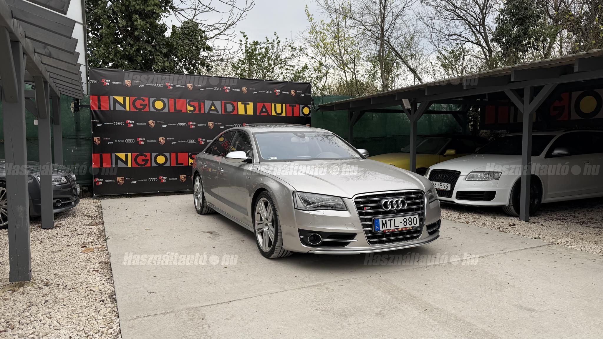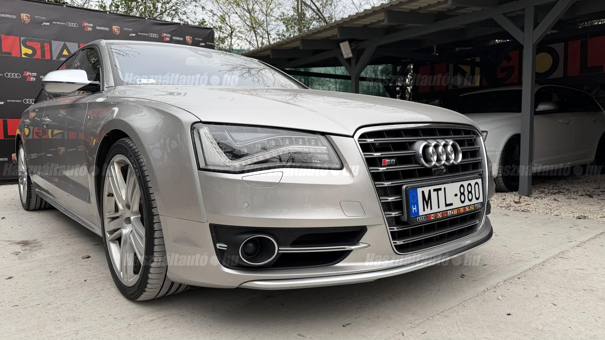 További 50 nagy felbontású kép: facebook/ingolstadtauto oldalunkon! AZ AUTÓK MEGTEKINTÉSÉHEZ MINDEN ESETBEN ELŐZETES TELEFONOS EGYEZTETÉS SZÜKSÉGES! BANKI HITELÜGYINTÉZÉSben is tudunk segíteni ez 12-84 hónapig terjedő periódusra ütemezhető. Legalább 20% önrésszel vehető fel.----------TÍPUS/ÁLLAPOT----------AZ ADOTT AUTÓRÓL:Gyönyörű Floret Silver színű, sportos luxuslimuzin.Fényezése szép, egységes. A két első sárvédő volt fényezve, motorháztető meg a bal hátsó sárvédő.A beltér megkímélt állapotú, nincsenek benne megmagyarázhatatlan, barbár sérülések. A szellőztethető, fűthető és masszázsfunkciós komfortülések az Audi egyik legkényelmesebb ülései közé tartoznak. Minden irányban elektromosan állíthatók (deréktámasz, oldaltartás, vállrész), így maximális kényelmet biztosítanak.Ennek részeként a hátsó ülések elektromosan állíthatók, így a háttámla dőlésszöge és az ülés pozíciója egyénileg szabályozható. Ez lehetővé teszi, hogy az utasok hosszabb utakon is maximális kényelemben, akár félig fekvő pozícióhoz közel utazzanak.A rendszer sok esetben kiegészül további prémium funkciókkal is, mint például:ülésfűtés és szellőztetés, masszázs funkció, valamint egyes kiviteleknél különálló, középkonzolos kialakítás, amely még exkluzívabb érzetet biztosít. A hátsó komfort csomaggal az S8 nem csupán vezetési élményben nyújt kiemelkedőt, hanem utasként is egy valódi luxuslimuzin szintjét hozza ideális választás azok számára, akik nemcsak vezetni, hanem utazni is a legmagasabb színvonalon szeretnének.A beltérben többféle anyag és szín találkozik, mégis tökéletes harmóniát alkotnak. Az autót Carbon csomaggal rendelték, így a luxus megjelenés mellett a sportosság is hangsúlyos.Nagyon sok extra található benne, ezeket a videóban részletesen bemutatjuk.Szerkezetileg és motorikusan hibátlan, minden extra tökéletesen működik.A 21 colos, Gyári Audi felnik jó állapotúak, minimális sérülések láthatók rajtuk. Jelenleg jó állapotú nyári gumikkal szerelt.A kerámia fékrendszer állapota jó, a fékbetétek még nincsenek kopásjelzőn.Minden tartozék rendelkezésre áll: összes gyári dokumentáció, vezetett szervizkönyv, valamint 2 db eredeti kulcs.A TÍPUSRÓL:Az Audi S8 D4 facelift előtti modelle 4.0 TFSI az Audi zászlóshajója, ahol a luxus és a teljesítmény valóban egy szinten van kezelve. Egy olyan autó, amely nem hivalkodik, mégis azonnal érezhető a jelenléte megjelenése még ma is komoly tekintélyt sugároz az utakon.Ebben a modellben a 4.0 literes, V8 biturbó erőforrás dolgozik, amely 520 lóerőt és 650 Nm nyomatékot biztosít. A hajtáslánc kifinomultsága és ereje tökéletes összhangban van: erőteljes, mégis finoman adagolható teljesítményt nyújt minden helyzetben.A motorhoz egy 8 fokozatú tiptronic automata váltó kapcsolódik, amely tartósságáról és megbízhatóságáról ismert, míg az állandó quattro összkerékhajtás gondoskodik arról, hogy az autó mindig stabilan és kiszámíthatóan viselkedjen, akár dinamikusabb használat mellett is.A V8-as motor működése rendkívül kifinomult: alacsony fordulaton is erőteljes, magasabb tartományban pedig folyamatosan, megszakítás nélkül építi fel a teljesítményt. A turbófeltöltők a hengersorok között kaptak helyet (ún. hot V elrendezés), ami gyors reakciót és hatékony működést eredményez.A technikai megoldások közül kiemelendő a hengerlekapcsolásos rendszer (COD), amely részterhelésnél csökkenti a fogyasztást, így a teljesítményhez képest meglepően élhető fenntartást tesz lehetővé.Gyári fogyasztási adatok:Városi fogyasztás: 14.4l/100kmOrszágúti fogyasztás: 7.6l/100kmVegyes fogyasztás: 10.1l/100kmAUTÓINKAT 1-3 ÉVIG TERJEDŐ GARANCIÁVAL IS TUDJUK ÉRTÉKESÍTENI, MEGÁLLAPODÁS SZERINT. Autóbeszámítás vagy bármilyen kérdés esetén a lenti telefonszámon keressen vagy WhatsApp-on, Viberen is elérhetőek vagyunk (email-t ne írjon!). TOVÁBBI KÜLÖNLEGES AUDIKÉRT KÖVESSE KÍNÁLATUNKAT FACEBOOKON: INGOLSTADTAUTO |