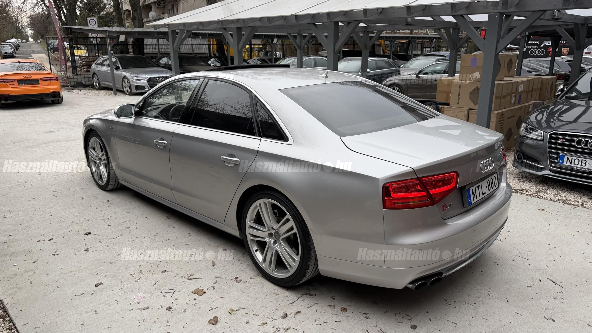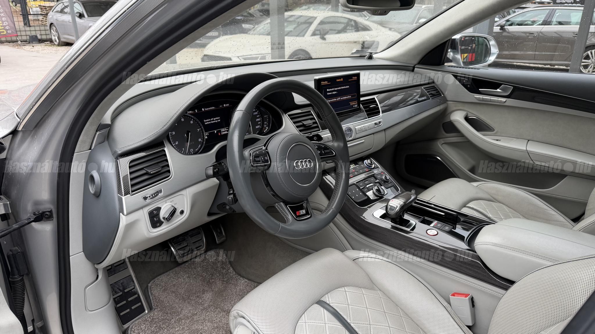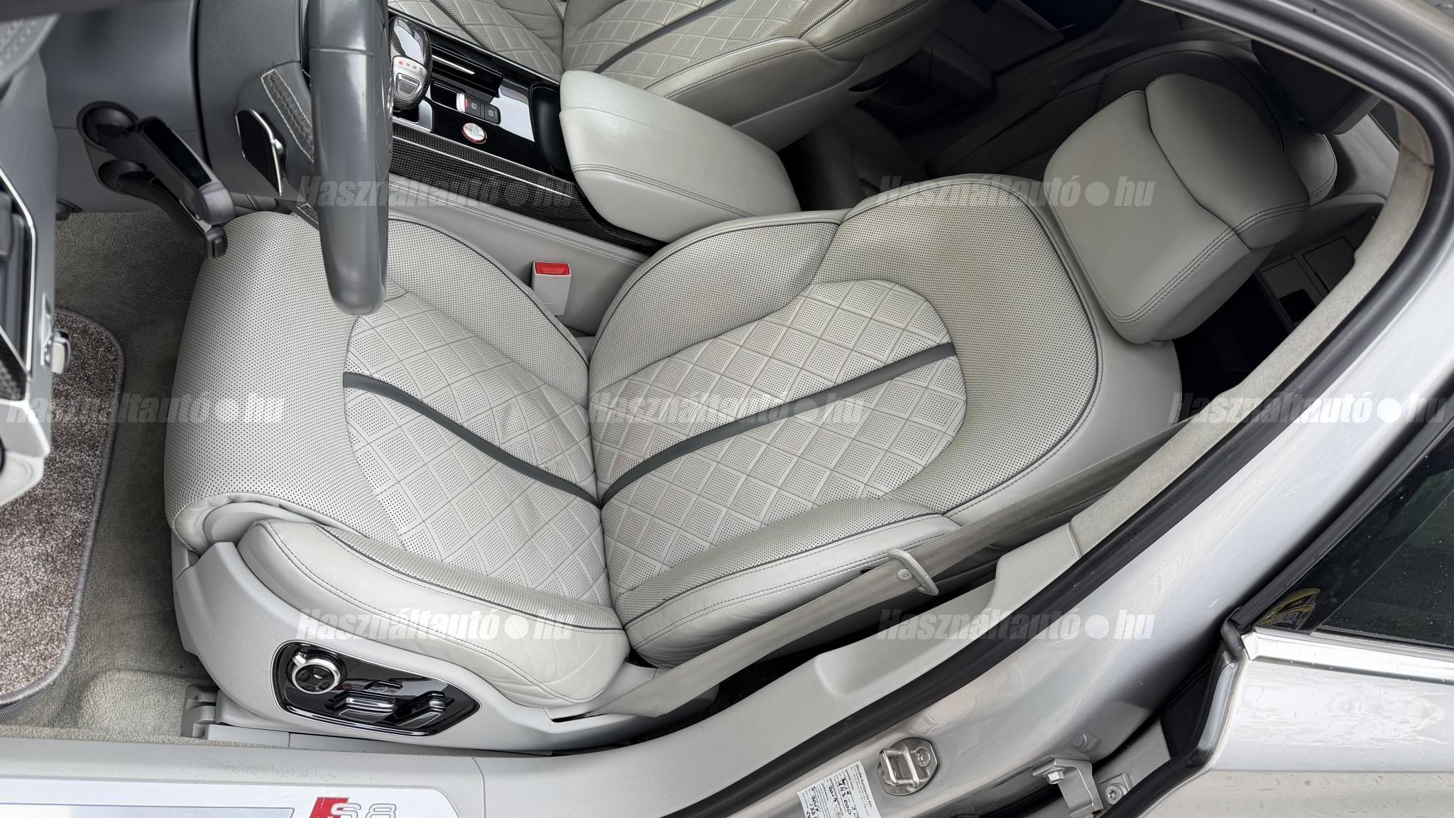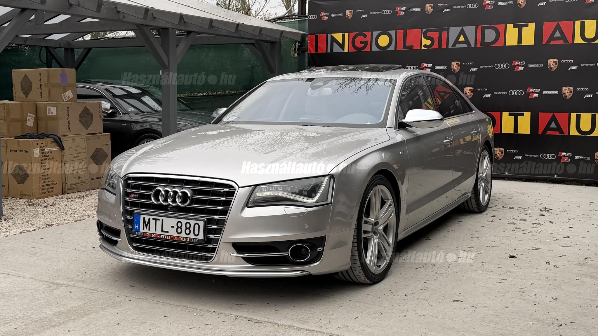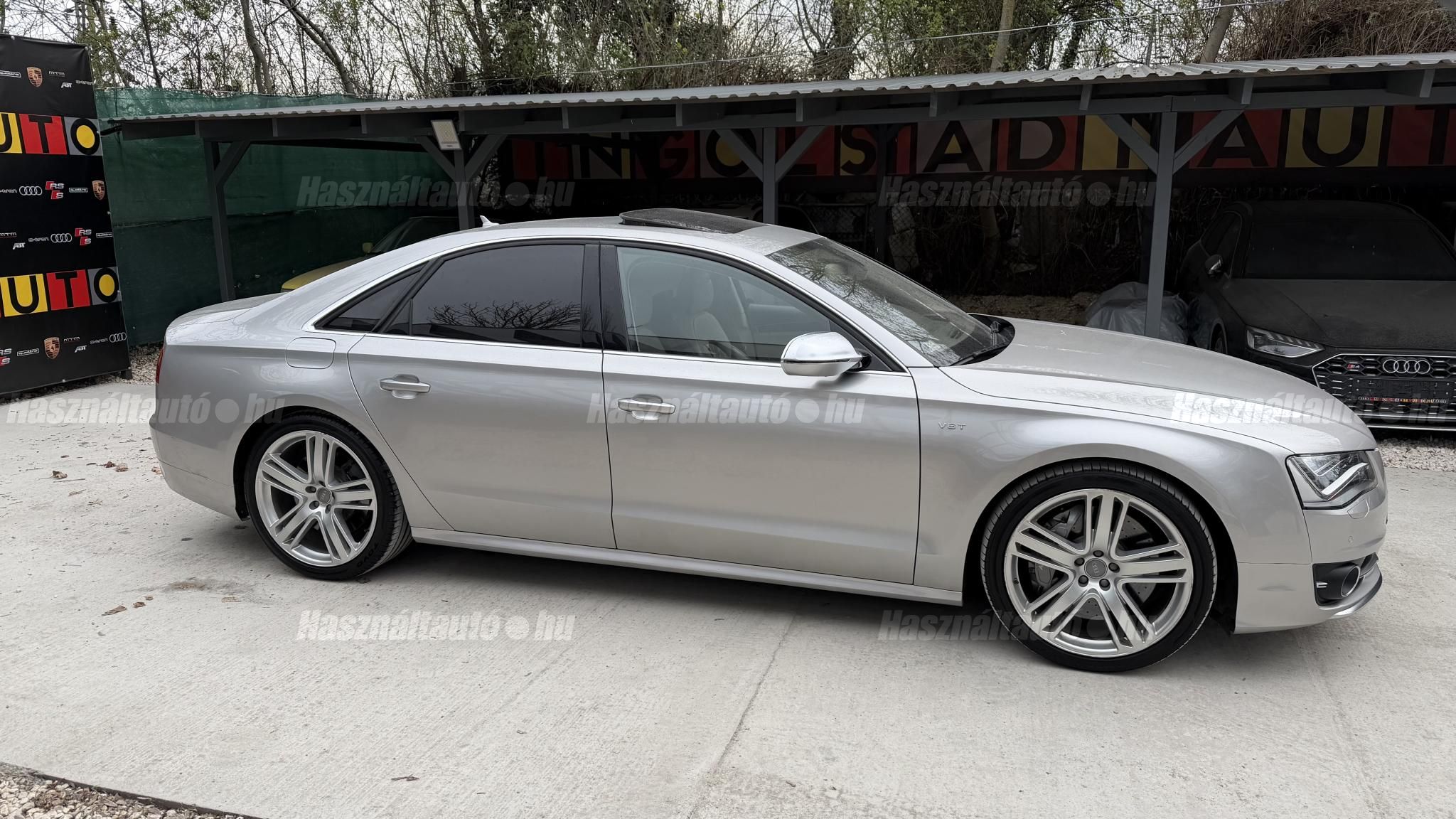 További 50 nagy felbontású kép: facebook/ingolstadtauto oldalunkon! AZ AUTÓK MEGTEKINTÉSÉHEZ MINDEN ESETBEN ELŐZETES TELEFONOS EGYEZTETÉS SZÜKSÉGES! BANKI HITELÜGYINTÉZÉSben is tudunk segíteni ez 12-84 hónapig terjedő periódusra ütemezhető. Legalább 20% önrésszel vehető fel.----------TÍPUS/ÁLLAPOT----------AZ ADOTT AUTÓRÓL:Gyönyörű Floret Silver színű, sportos luxuslimuzin.Fényezése szép, egységes. A két első sárvédő volt fényezve, motorháztető meg a bal hátsó sárvédő.A beltér megkímélt állapotú, nincsenek benne megmagyarázhatatlan, barbár sérülések. A szellőztethető, fűthető és masszázsfunkciós komfortülések az Audi egyik legkényelmesebb ülései közé tartoznak. Minden irányban elektromosan állíthatók (deréktámasz, oldaltartás, vállrész), így maximális kényelmet biztosítanak.Ennek részeként a hátsó ülések elektromosan állíthatók, így a háttámla dőlésszöge és az ülés pozíciója egyénileg szabályozható. Ez lehetővé teszi, hogy az utasok hosszabb utakon is maximális kényelemben, akár félig fekvő pozícióhoz közel utazzanak.A rendszer sok esetben kiegészül további prémium funkciókkal is, mint például:ülésfűtés és szellőztetés, masszázs funkció, valamint egyes kiviteleknél különálló, középkonzolos kialakítás, amely még exkluzívabb érzetet biztosít. A hátsó komfort csomaggal az S8 nem csupán vezetési élményben nyújt kiemelkedőt, hanem utasként is egy valódi luxuslimuzin szintjét hozza ideális választás azok számára, akik nemcsak vezetni, hanem utazni is a legmagasabb színvonalon szeretnének.A beltérben többféle anyag és szín találkozik, mégis tökéletes harmóniát alkotnak. Az autót Carbon csomaggal rendelték, így a luxus megjelenés mellett a sportosság is hangsúlyos.Nagyon sok extra található benne, ezeket a videóban részletesen bemutatjuk.Szerkezetileg és motorikusan hibátlan, minden extra tökéletesen működik.A 21 colos, Gyári Audi felnik jó állapotúak, minimális sérülések láthatók rajtuk. Jelenleg jó állapotú nyári gumikkal szerelt.A kerámia fékrendszer állapota jó, a fékbetétek még nincsenek kopásjelzőn.Minden tartozék rendelkezésre áll: összes gyári dokumentáció, vezetett szervizkönyv, valamint 2 db eredeti kulcs.A TÍPUSRÓL:Az Audi S8 D4 facelift előtti modelle 4.0 TFSI az Audi zászlóshajója, ahol a luxus és a teljesítmény valóban egy szinten van kezelve. Egy olyan autó, amely nem hivalkodik, mégis azonnal érezhető a jelenléte megjelenése még ma is komoly tekintélyt sugároz az utakon.Ebben a modellben a 4.0 literes, V8 biturbó erőforrás dolgozik, amely 520 lóerőt és 650 Nm nyomatékot biztosít. A hajtáslánc kifinomultsága és ereje tökéletes összhangban van: erőteljes, mégis finoman adagolható teljesítményt nyújt minden helyzetben.A motorhoz egy 8 fokozatú tiptronic automata váltó kapcsolódik, amely tartósságáról és megbízhatóságáról ismert, míg az állandó quattro összkerékhajtás gondoskodik arról, hogy az autó mindig stabilan és kiszámíthatóan viselkedjen, akár dinamikusabb használat mellett is.A V8-as motor működése rendkívül kifinomult: alacsony fordulaton is erőteljes, magasabb tartományban pedig folyamatosan, megszakítás nélkül építi fel a teljesítményt. A turbófeltöltők a hengersorok között kaptak helyet (ún. hot V elrendezés), ami gyors reakciót és hatékony működést eredményez.A technikai megoldások közül kiemelendő a hengerlekapcsolásos rendszer (COD), amely részterhelésnél csökkenti a fogyasztást, így a teljesítményhez képest meglepően élhető fenntartást tesz lehetővé.Gyári fogyasztási adatok:Városi fogyasztás: 14.4l/100kmOrszágúti fogyasztás: 7.6l/100kmVegyes fogyasztás: 10.1l/100kmAUTÓINKAT 1-3 ÉVIG TERJEDŐ GARANCIÁVAL IS TUDJUK ÉRTÉKESÍTENI, MEGÁLLAPODÁS SZERINT. Autóbeszámítás vagy bármilyen kérdés esetén a lenti telefonszámon keressen vagy WhatsApp-on, Viberen is elérhetőek vagyunk (email-t ne írjon!). TOVÁBBI KÜLÖNLEGES AUDIKÉRT KÖVESSE KÍNÁLATUNKAT FACEBOOKON: INGOLSTADTAUTO |