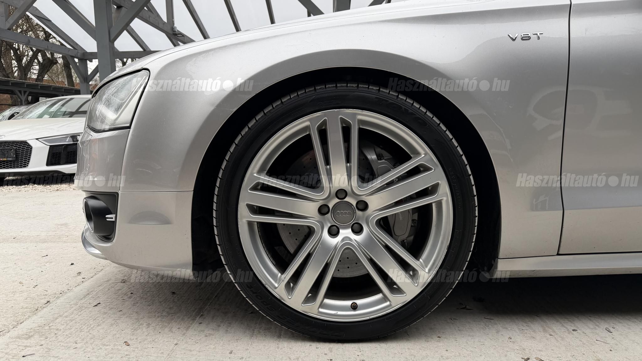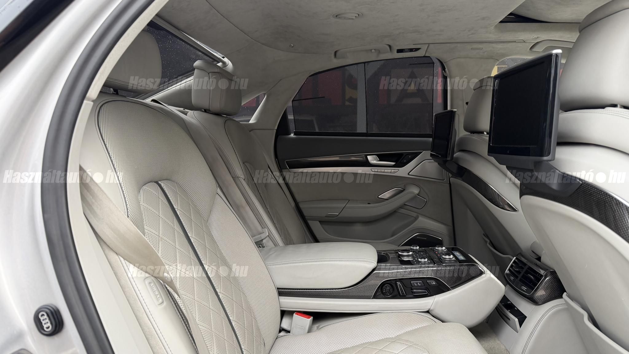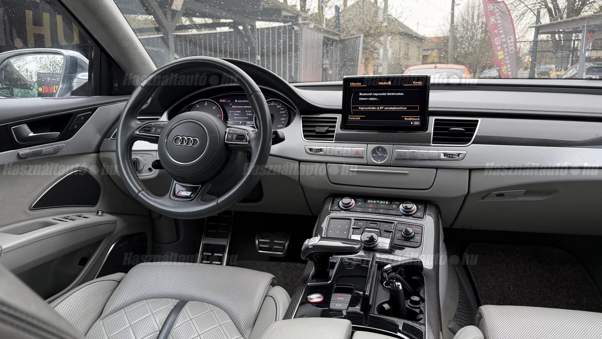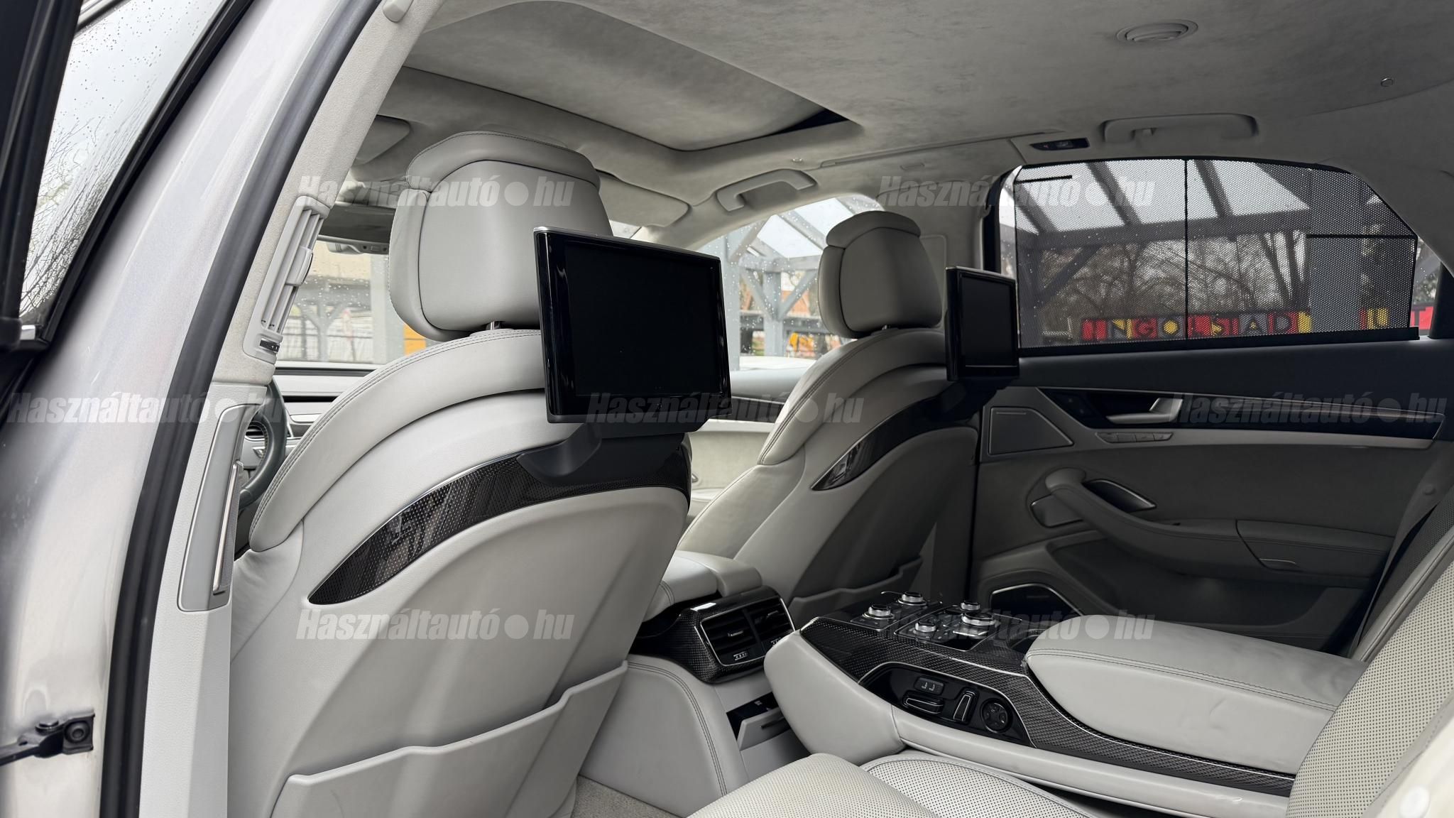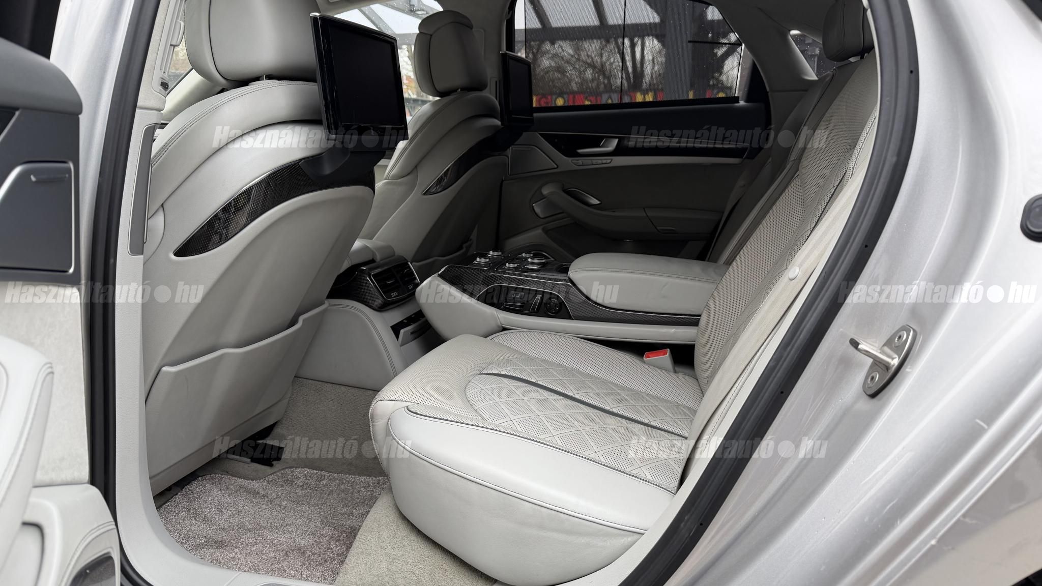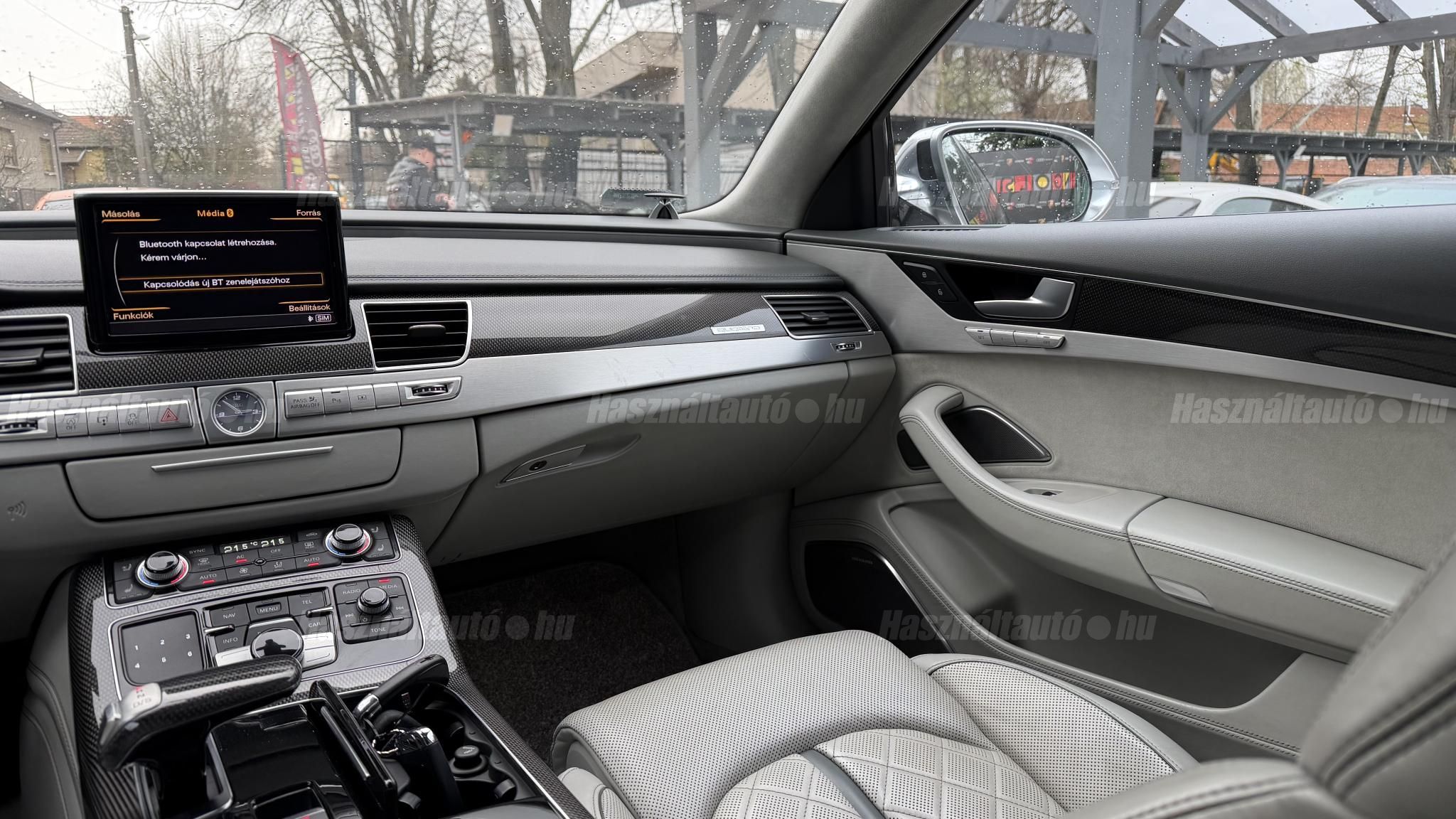 További 50 nagy felbontású kép: facebook/ingolstadtauto oldalunkon! AZ AUTÓK MEGTEKINTÉSÉHEZ MINDEN ESETBEN ELŐZETES TELEFONOS EGYEZTETÉS SZÜKSÉGES! BANKI HITELÜGYINTÉZÉSben is tudunk segíteni ez 12-84 hónapig terjedő periódusra ütemezhető. Legalább 20% önrésszel vehető fel.----------TÍPUS/ÁLLAPOT----------AZ ADOTT AUTÓRÓL:Gyönyörű Floret Silver színű, sportos luxuslimuzin.Fényezése szép, egységes. A két első sárvédő volt fényezve, motorháztető meg a bal hátsó sárvédő.A beltér megkímélt állapotú, nincsenek benne megmagyarázhatatlan, barbár sérülések. A szellőztethető, fűthető és masszázsfunkciós komfortülések az Audi egyik legkényelmesebb ülései közé tartoznak. Minden irányban elektromosan állíthatók (deréktámasz, oldaltartás, vállrész), így maximális kényelmet biztosítanak.Ennek részeként a hátsó ülések elektromosan állíthatók, így a háttámla dőlésszöge és az ülés pozíciója egyénileg szabályozható. Ez lehetővé teszi, hogy az utasok hosszabb utakon is maximális kényelemben, akár félig fekvő pozícióhoz közel utazzanak.A rendszer sok esetben kiegészül további prémium funkciókkal is, mint például:ülésfűtés és szellőztetés, masszázs funkció, valamint egyes kiviteleknél különálló, középkonzolos kialakítás, amely még exkluzívabb érzetet biztosít. A hátsó komfort csomaggal az S8 nem csupán vezetési élményben nyújt kiemelkedőt, hanem utasként is egy valódi luxuslimuzin szintjét hozza ideális választás azok számára, akik nemcsak vezetni, hanem utazni is a legmagasabb színvonalon szeretnének.A beltérben többféle anyag és szín találkozik, mégis tökéletes harmóniát alkotnak. Az autót Carbon csomaggal rendelték, így a luxus megjelenés mellett a sportosság is hangsúlyos.Nagyon sok extra található benne, ezeket a videóban részletesen bemutatjuk.Szerkezetileg és motorikusan hibátlan, minden extra tökéletesen működik.A 21 colos, Gyári Audi felnik jó állapotúak, minimális sérülések láthatók rajtuk. Jelenleg jó állapotú nyári gumikkal szerelt.A kerámia fékrendszer állapota jó, a fékbetétek még nincsenek kopásjelzőn.Minden tartozék rendelkezésre áll: összes gyári dokumentáció, vezetett szervizkönyv, valamint 2 db eredeti kulcs.A TÍPUSRÓL:Az Audi S8 D4 facelift előtti modelle 4.0 TFSI az Audi zászlóshajója, ahol a luxus és a teljesítmény valóban egy szinten van kezelve. Egy olyan autó, amely nem hivalkodik, mégis azonnal érezhető a jelenléte megjelenése még ma is komoly tekintélyt sugároz az utakon.Ebben a modellben a 4.0 literes, V8 biturbó erőforrás dolgozik, amely 520 lóerőt és 650 Nm nyomatékot biztosít. A hajtáslánc kifinomultsága és ereje tökéletes összhangban van: erőteljes, mégis finoman adagolható teljesítményt nyújt minden helyzetben.A motorhoz egy 8 fokozatú tiptronic automata váltó kapcsolódik, amely tartósságáról és megbízhatóságáról ismert, míg az állandó quattro összkerékhajtás gondoskodik arról, hogy az autó mindig stabilan és kiszámíthatóan viselkedjen, akár dinamikusabb használat mellett is.A V8-as motor működése rendkívül kifinomult: alacsony fordulaton is erőteljes, magasabb tartományban pedig folyamatosan, megszakítás nélkül építi fel a teljesítményt. A turbófeltöltők a hengersorok között kaptak helyet (ún. hot V elrendezés), ami gyors reakciót és hatékony működést eredményez.A technikai megoldások közül kiemelendő a hengerlekapcsolásos rendszer (COD), amely részterhelésnél csökkenti a fogyasztást, így a teljesítményhez képest meglepően élhető fenntartást tesz lehetővé.Gyári fogyasztási adatok:Városi fogyasztás: 14.4l/100kmOrszágúti fogyasztás: 7.6l/100kmVegyes fogyasztás: 10.1l/100kmAUTÓINKAT 1-3 ÉVIG TERJEDŐ GARANCIÁVAL IS TUDJUK ÉRTÉKESÍTENI, MEGÁLLAPODÁS SZERINT. Autóbeszámítás vagy bármilyen kérdés esetén a lenti telefonszámon keressen vagy WhatsApp-on, Viberen is elérhetőek vagyunk (email-t ne írjon!). TOVÁBBI KÜLÖNLEGES AUDIKÉRT KÖVESSE KÍNÁLATUNKAT FACEBOOKON: INGOLSTADTAUTO |