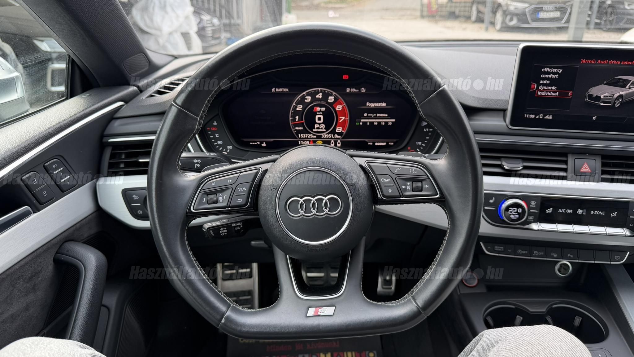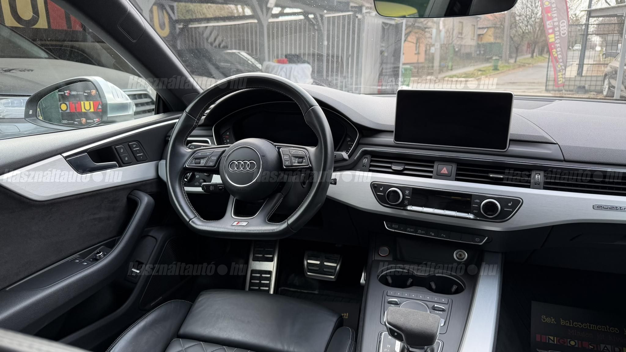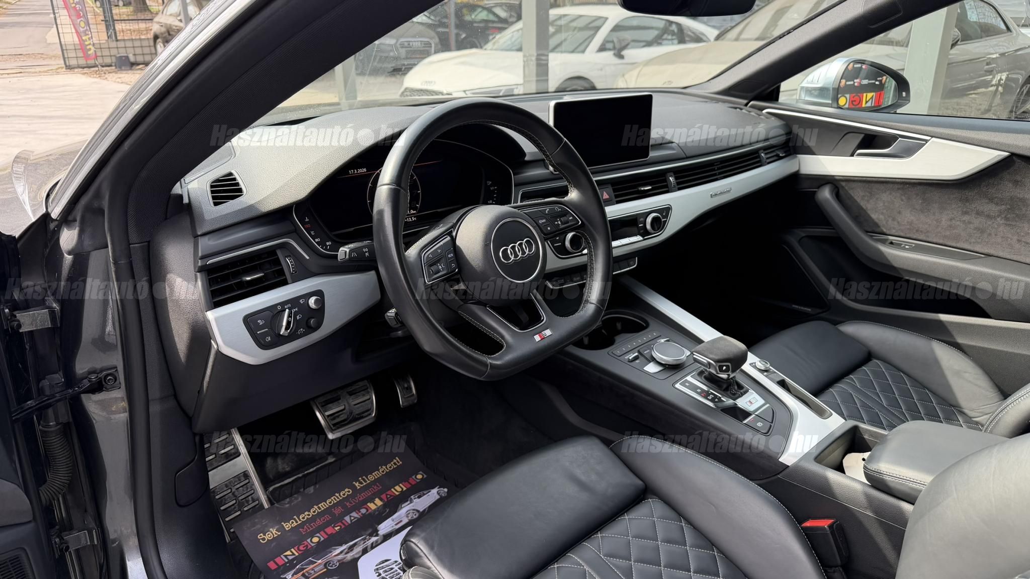 További 80 nagy felbontású kép: facebook/ingolstadtauto oldalunkon! AZ AUTÓK MEGTEKINTÉSÉHEZ MINDEN ESETBEN ELŐZETES TELEFONOS EGYEZTETÉS SZÜKSÉGES! ---------- RÉSZLET FIZETÉSSEL IS ELVIHETŐ: Nincs hitelbírálat, nem gond a BAR lista, nem kérünk jövedelemigazolást sem. Kezdő részlet: 9 millió Ft További részletek: 12 x 380.000Ft -havi részletekben egy éven át. NEM tartalmazza a kötelező biztosítás és a CASCO költségét, melyek feltételei a szerződés megkötésének. Magasabb kezdő részlet befizetése esetén a további havi részletek alcsonyabbak lehetnek. Alacsonyabb kezdő részlet befizetésére nincs lehetőség! További feltételekért és információkért keressen minket személyesen vagy telefonon. BANKI HITELÜGYINTÉZÉSben is tudunk segíteni ez 12-84 hónapig terjedő periódusra ütemezhető. Legalább 20% önrésszel vehető fel.----------TÍPUS/ÁLLAPOT----------AZ ADOTT AUTÓRÓL:Ezt a kupét kifejezetten úgy kerestük, hogy a márka egyik legnépszerűbb színében, gazdag felszereltséggel kínálhassuk eladásra. Egy Daytona szürke kupéról van szó, festékmérés alapján törésmentes, azonban az egyik első sárvédő cserélve volt. Fényezése szép, szinte hibátlan állapotú.A beltér megkímélt állapotú, kopás-, karc- és kiülésmentes, szinte újszerű. Természetesen sport kagylóülésekkel szerelt, ami elengedhetetlen egy igazi S5 esetében. Felszereltségében megtalálható többek között a head-up display, sávtartó asszisztens, adaptív tempomat, masszázsülés. Virtual Cockpittel kerestük, mivel rendkívül informatív, és az autó megjelenését is sokkal modernebbé teszi ez az óracsoport.A 19 colos gyári Audi felnik állapota enyhén padkázott, a jobb első felnin egy nagyobb padkanyom található. Jelenleg jó állapotú nyári gumikkal van szerelve. A fékrendszer állapota jó, a fékbetétek még nem érték el a kopásjelzőt.Az autóban jelenleg 153 000 km van. Az összes francia műszaki vizsgán rögzített aktuális kilométerállás dokumentálva van, emellett a végig vezetett szervizkönyv is rendelkezésre áll. Szerkezetileg és motorikusan hibátlan, minden extra tökéletesen működik. Minden tartozék, az összes gyári dokumentáció, a vezetett szervizkönyv, valamint 2 darab eredeti kulcs rendelkezésre áll.A TÍPUSRÓL:Továbbra is az egyik legjobb konstrukció szerintem ami S5-ben készült. Miért?